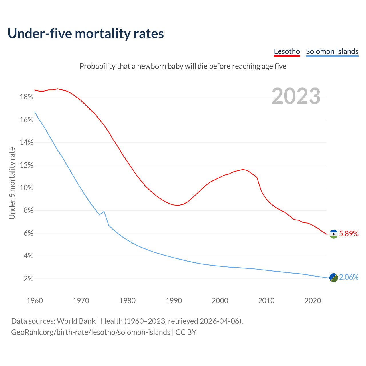 The chance that a newborn baby will die before reaching age five is 5.89% in Lesotho and 2.06% in the Solomon Islands. Above is a chart with historical data on under-five mortality rates.