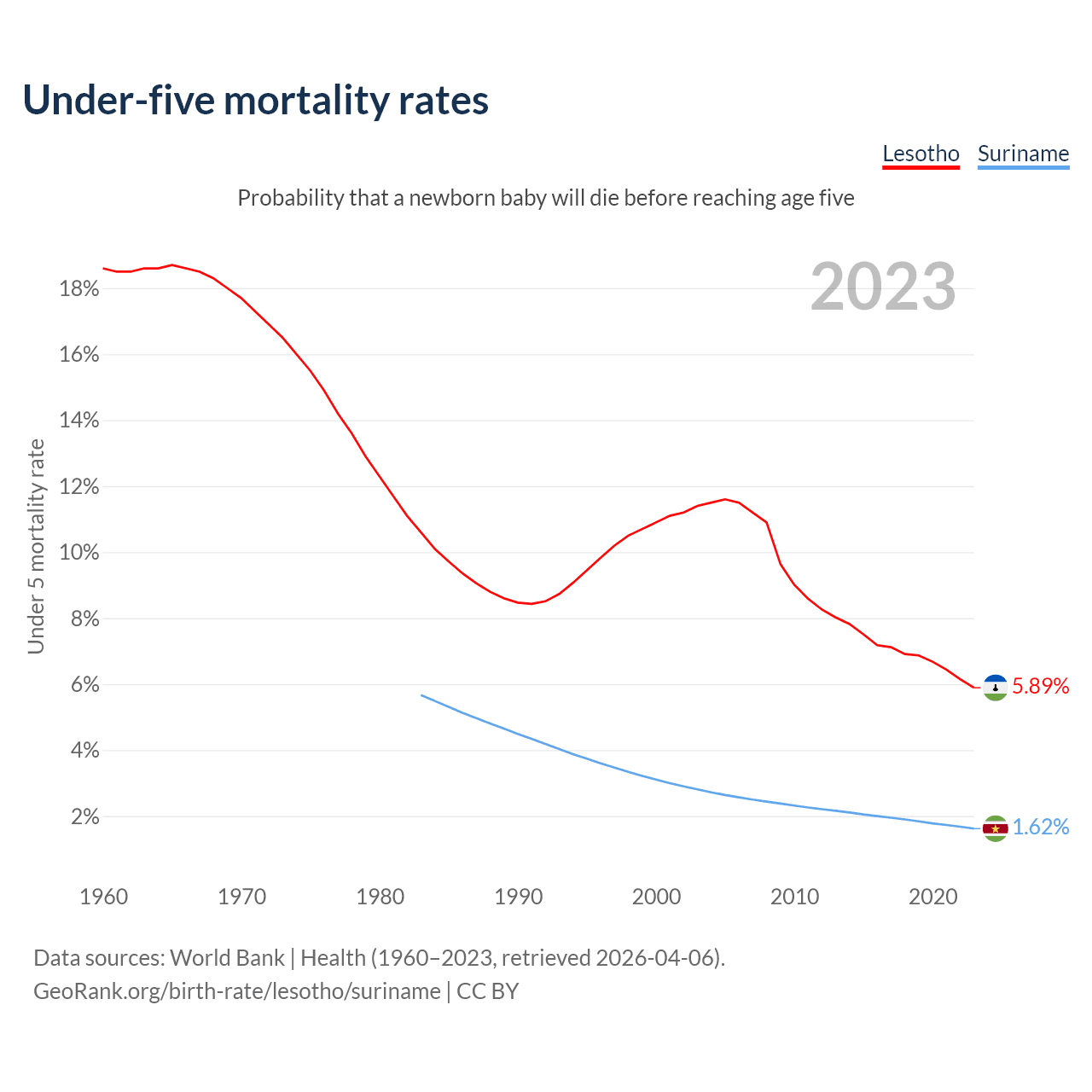 The chance that a newborn baby will die before reaching age five is 5.89% in Lesotho and 1.62% in Suriname. Above is a chart with historical data on under-five mortality rates.