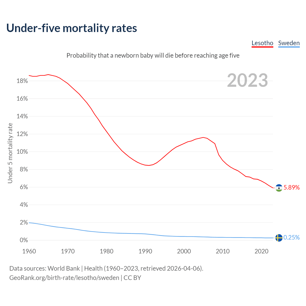 The chance that a newborn baby will die before reaching age five is 5.89% in Lesotho and 0.25% in Sweden. Above is a chart with historical data on under-five mortality rates.