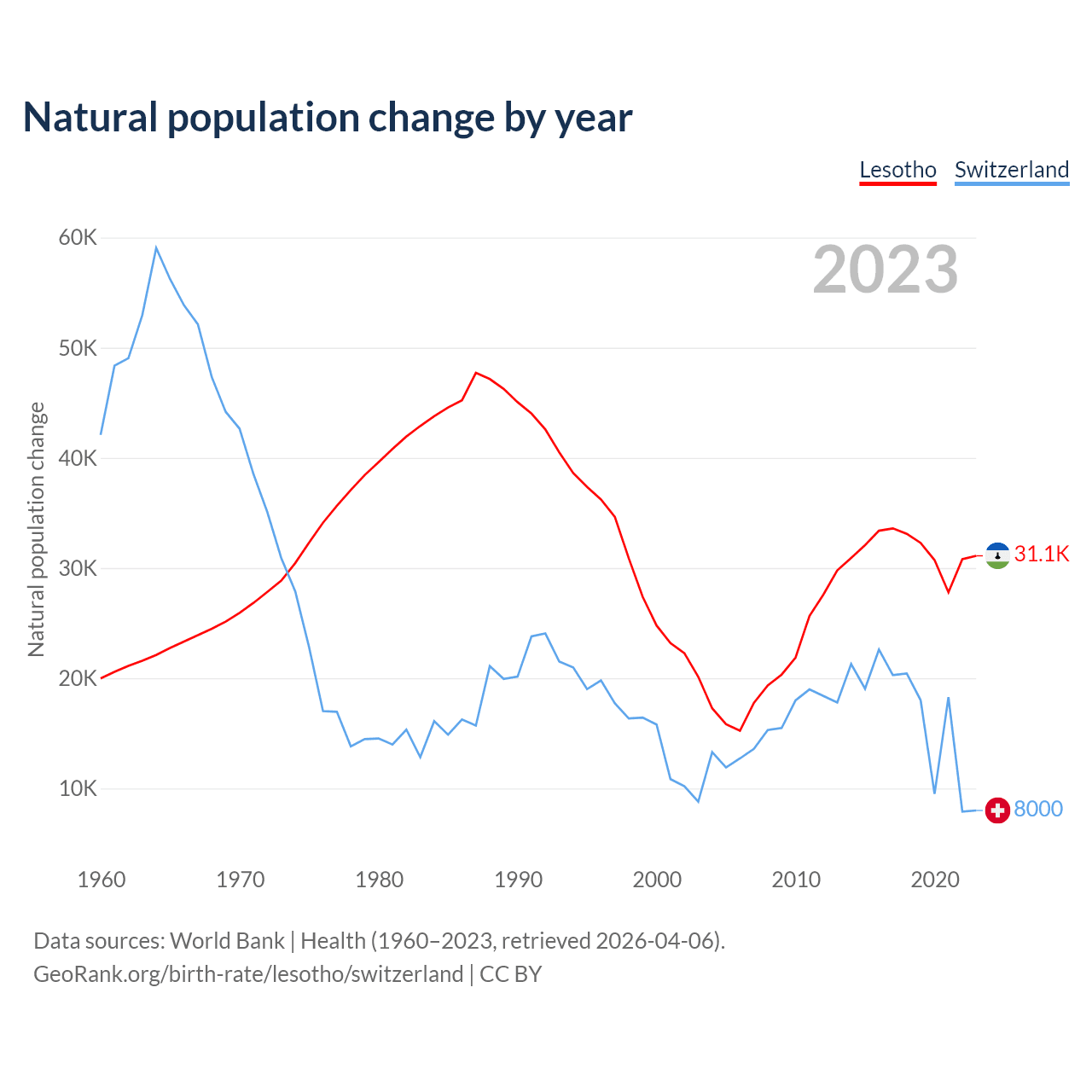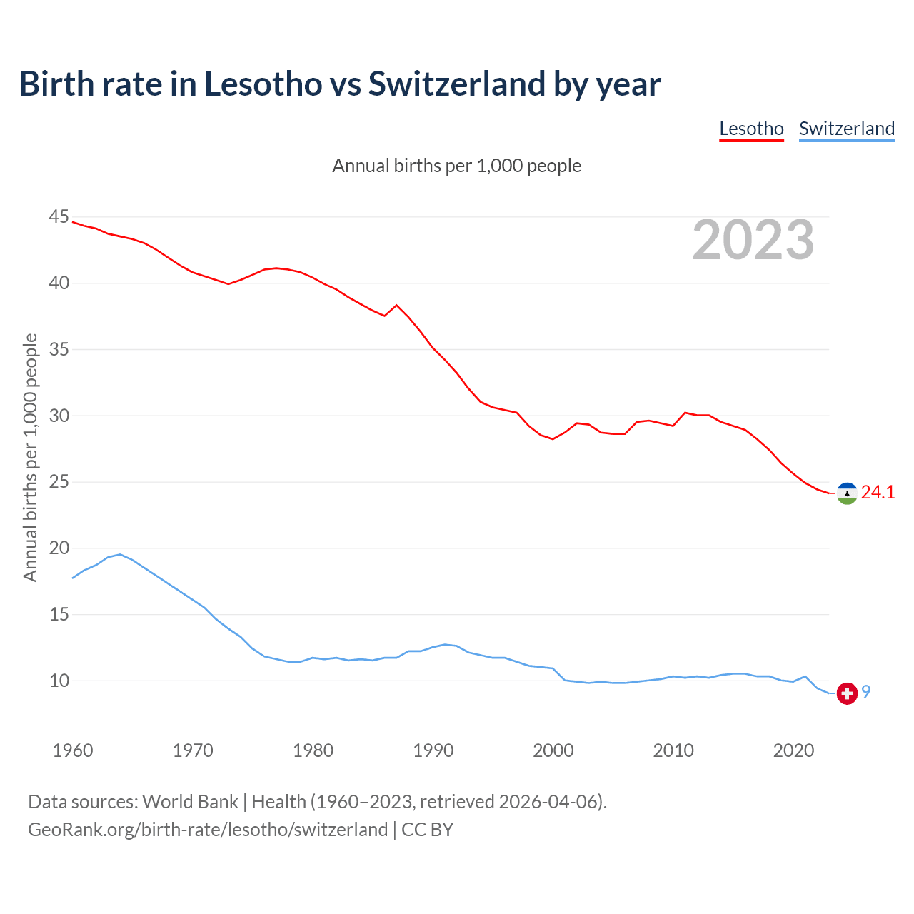 Lesotho has an annual birth rate of 24.1 births per 1,000 people, compared to 9 for Switzerland. The average number of children a woman is expected to have during her lifetime — the fertility rate, is 2.69 in Lesotho and 1.33 in Switzerland — 50.6% difference.