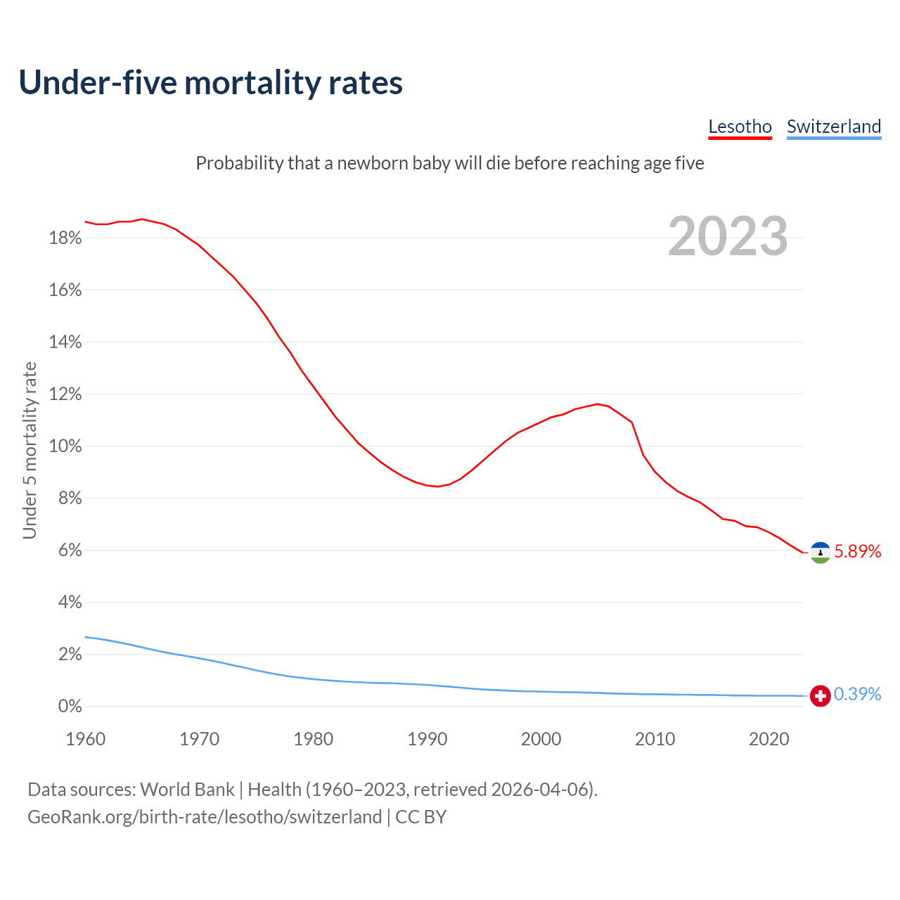 The chance that a newborn baby will die before reaching age five is 5.89% in Lesotho and 0.39% in Switzerland. Above is a chart with historical data on under-five mortality rates.