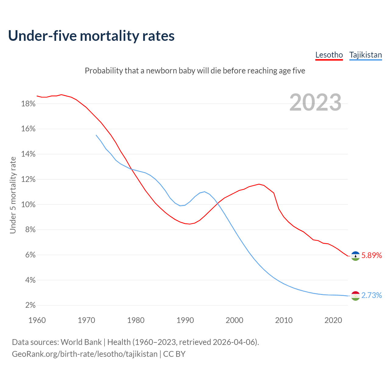 The chance that a newborn baby will die before reaching age five is 5.89% in Lesotho and 2.73% in Tajikistan. Above is a chart with historical data on under-five mortality rates.