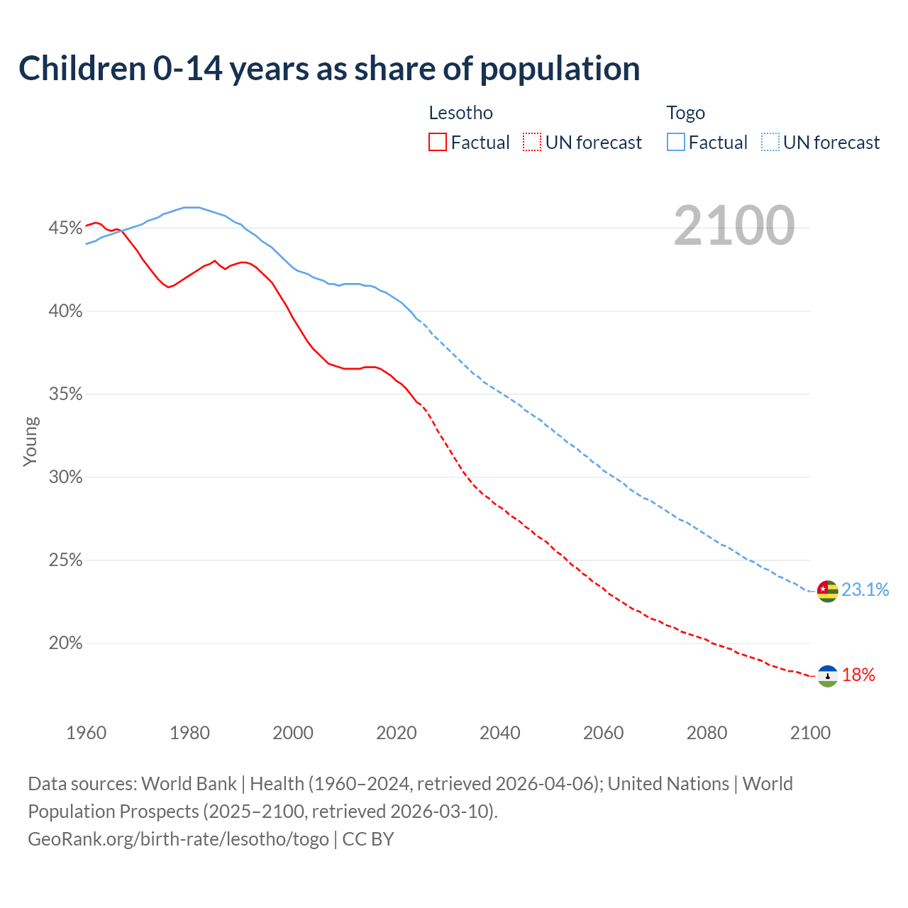 According to the latest available data on birth rates, the fertility rate in Lesotho was 2.69 children per woman in 2023, compared to 4.19 in Togo in 2023. The replacement level is considered to be 2.1 children per woman.