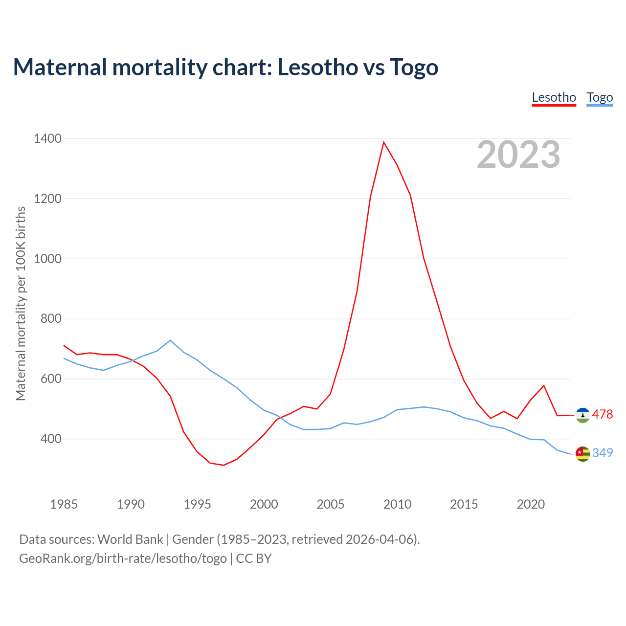 The maternal mortality rate, which is the probability of dying during childbirth or within 42 days of pregnancy termination, is 478 deaths per 100,000 live births in Lesotho, compared to 349 deaths in Togo.