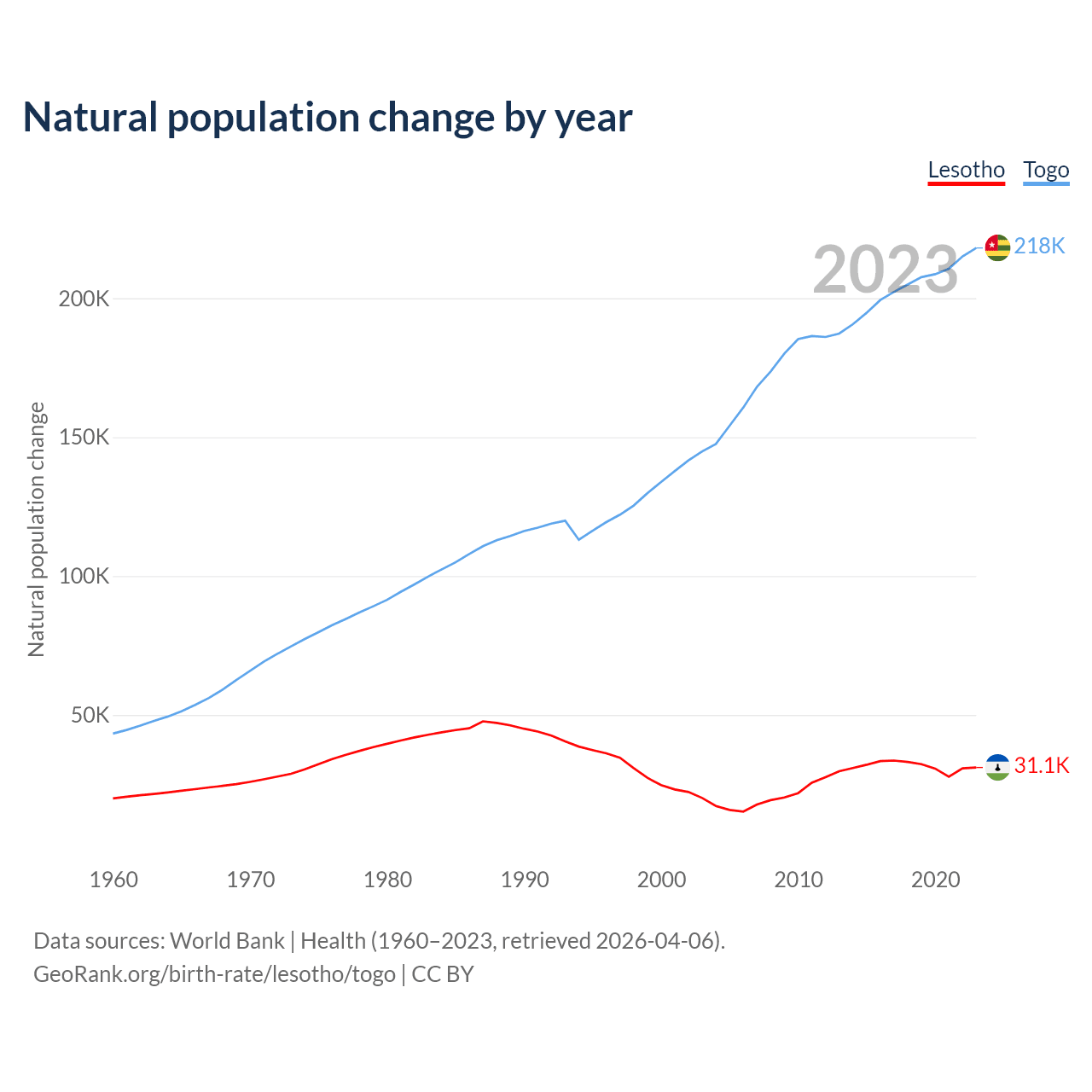 Lesotho has an annual birth rate of 24.1 births per 1,000 people, compared to 31.1 for Togo. The average number of children a woman is expected to have during her lifetime — the fertility rate, is 2.69 in Lesotho and 4.19 in Togo — 55.6% difference.