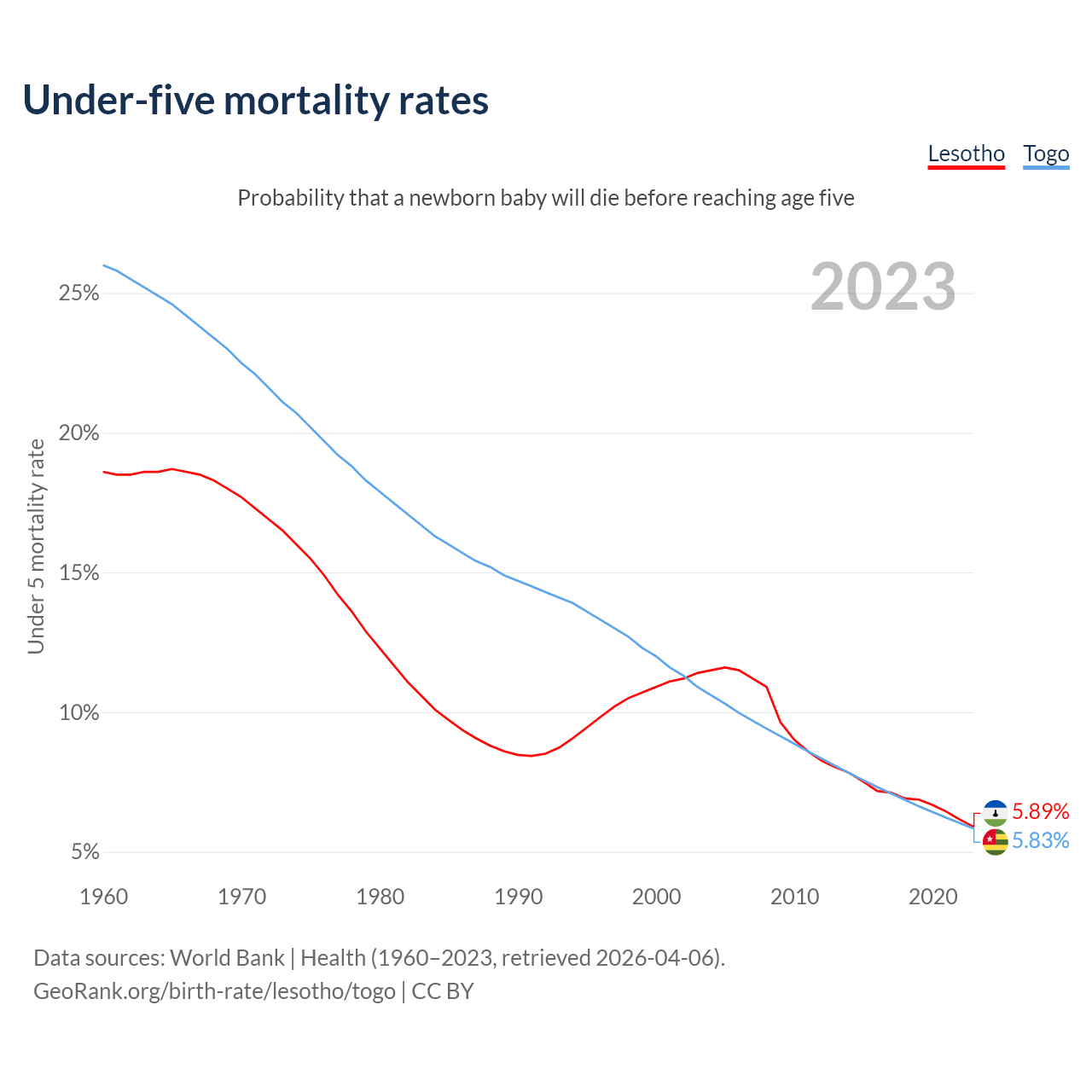 The chance that a newborn baby will die before reaching age five is 5.89% in Lesotho and 5.83% in Togo. Above is a chart with historical data on under-five mortality rates.