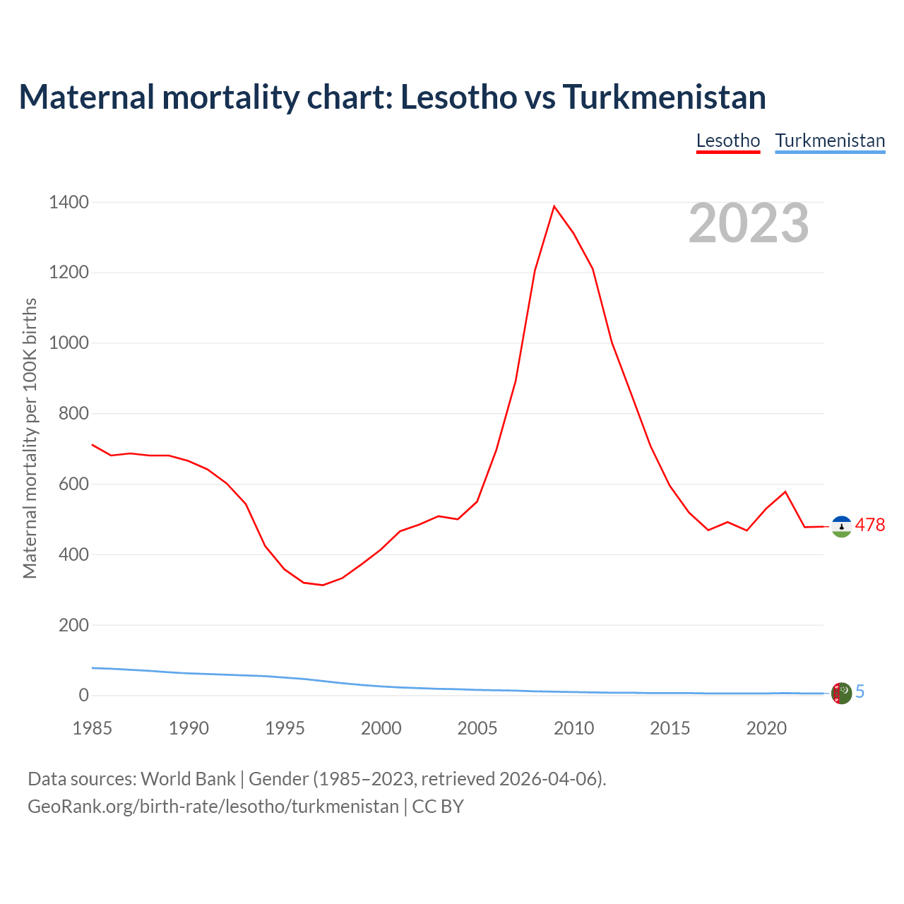The maternal mortality rate, which is the probability of dying during childbirth or within 42 days of pregnancy termination, is 478 deaths per 100,000 live births in Lesotho, compared to 5 deaths in Turkmenistan.