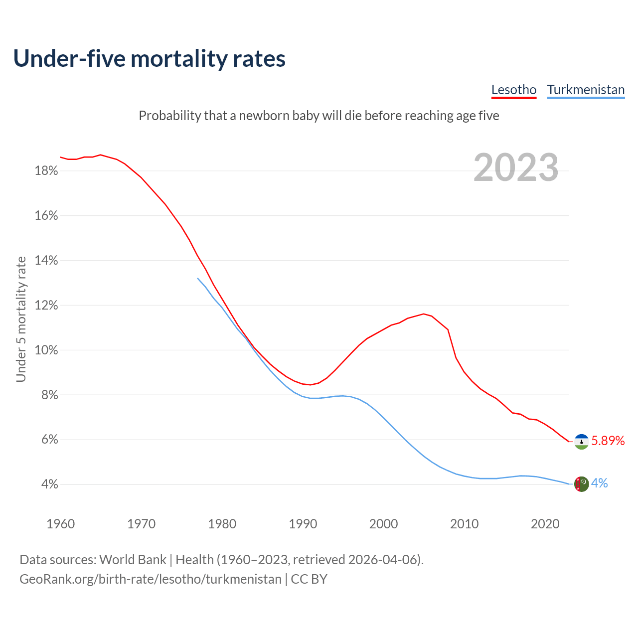 The chance that a newborn baby will die before reaching age five is 5.89% in Lesotho and 4% in Turkmenistan. Above is a chart with historical data on under-five mortality rates.