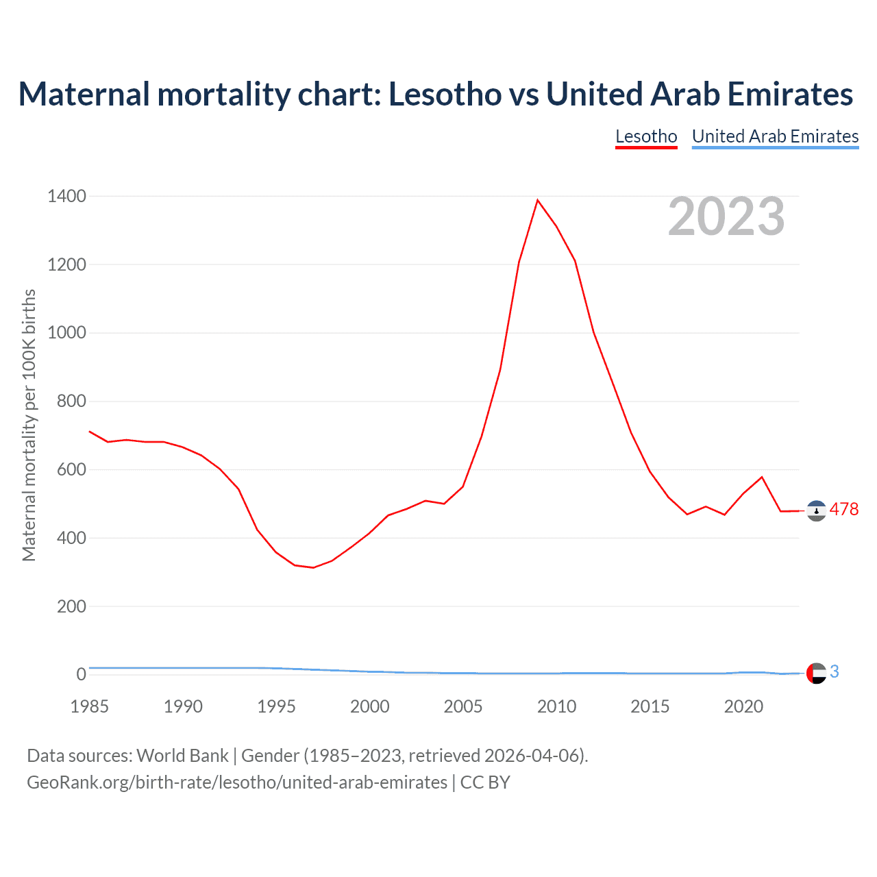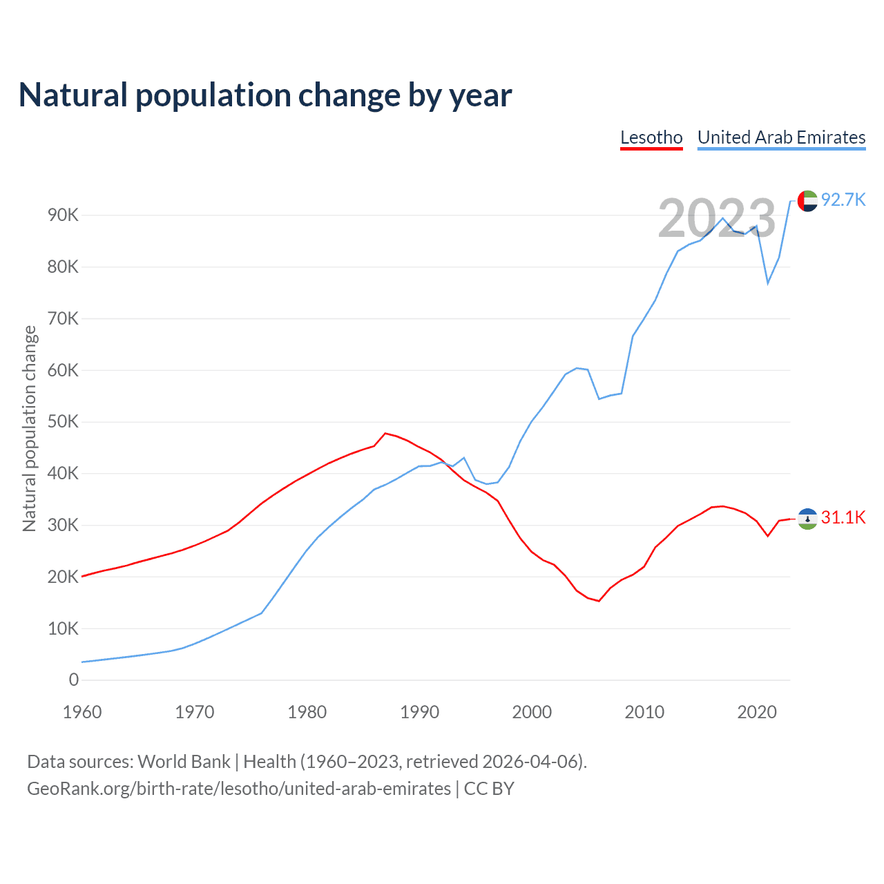 Lesotho has an annual birth rate of 24.1 births per 1,000 people, compared to 9.77 for the United Arab Emirates. The average number of children a woman is expected to have during her lifetime — the fertility rate, is 2.69 in Lesotho and 1.2 in the United Arab Emirates — 55.5% difference.