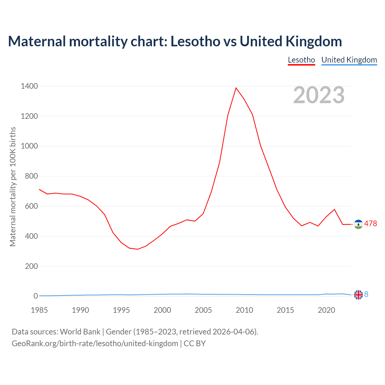 The maternal mortality rate, which is the probability of dying during childbirth or within 42 days of pregnancy termination, is 478 deaths per 100,000 live births in Lesotho, compared to 8 deaths in the United Kingdom.