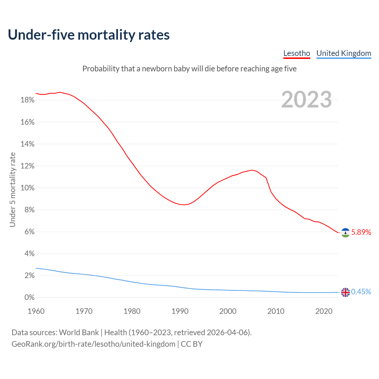 The chance that a newborn baby will die before reaching age five is 5.89% in Lesotho and 0.45% in the United Kingdom. Above is a chart with historical data on under-five mortality rates.