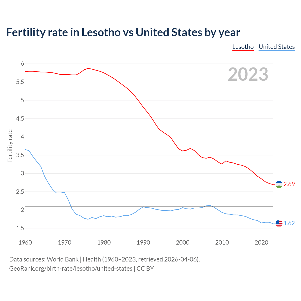 According to the latest available data on birth rates, the fertility rate in Lesotho was 2.69 children per woman in 2023, compared to 1.62 in the United States in 2023. The replacement level is considered to be 2.1 children per woman.