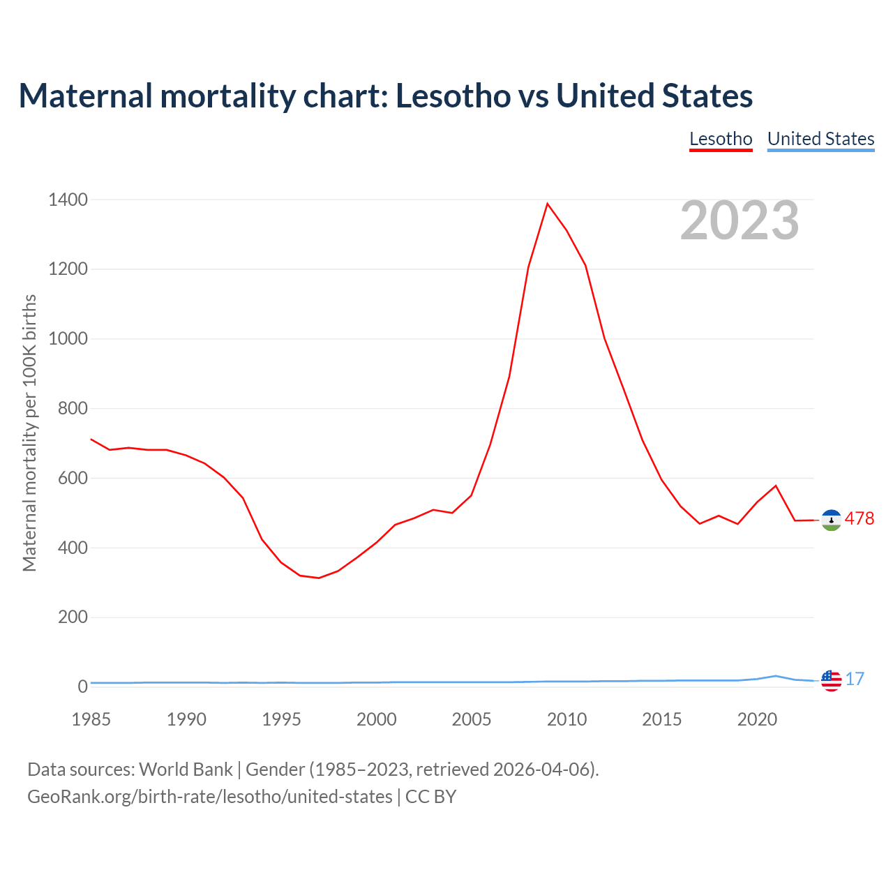 - Annual births per 1,000 women ages 15-19 (adolescent birth rate or teenage mother rate) is 70.6 in Lesotho vs 13.1 in the United States.