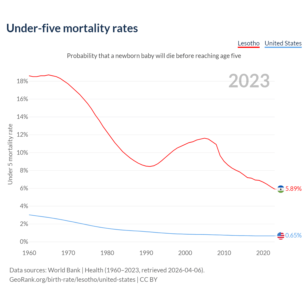 The chance that a newborn baby will die before reaching age five is 5.89% in Lesotho and 0.65% in the United States. Above is a chart with historical data on under-five mortality rates.