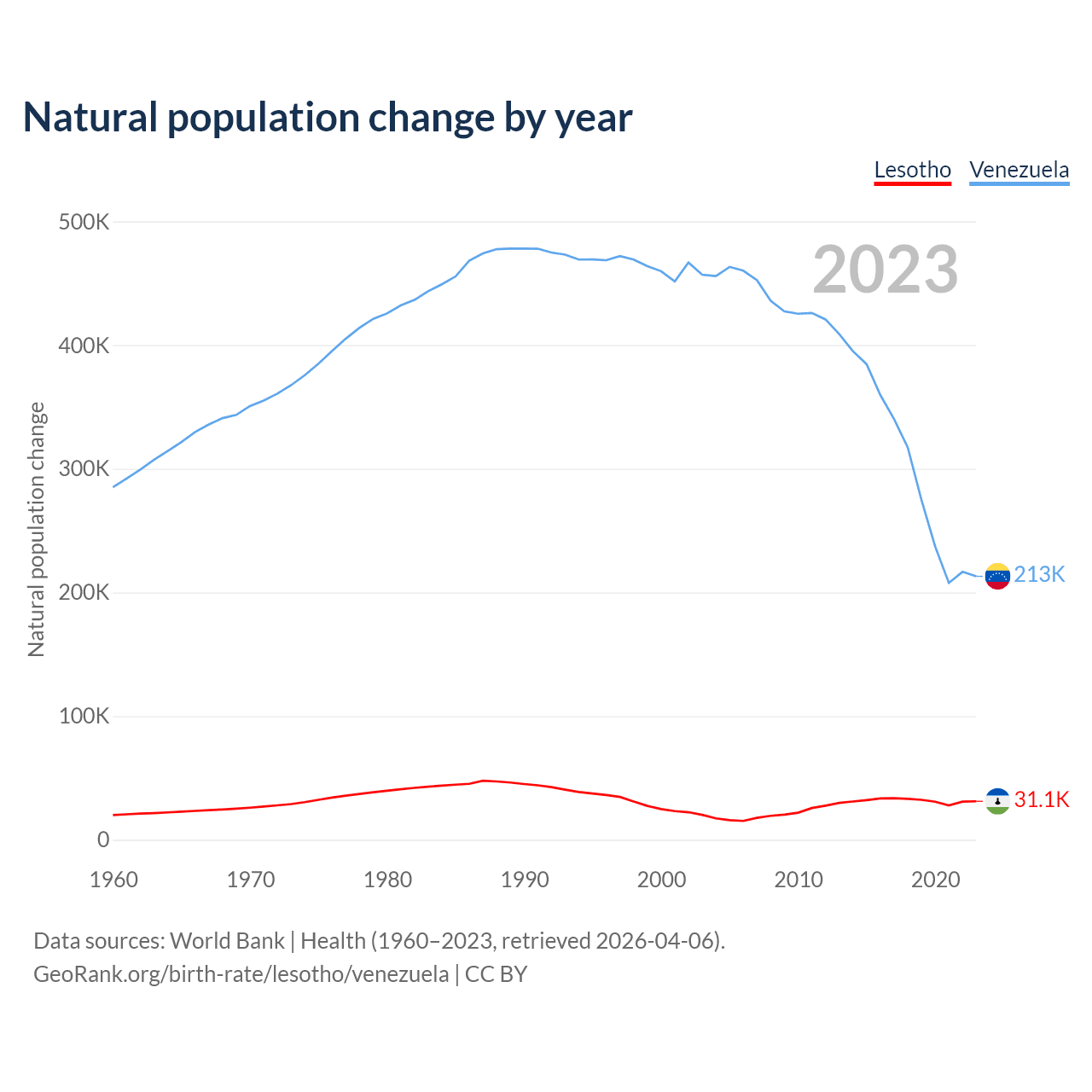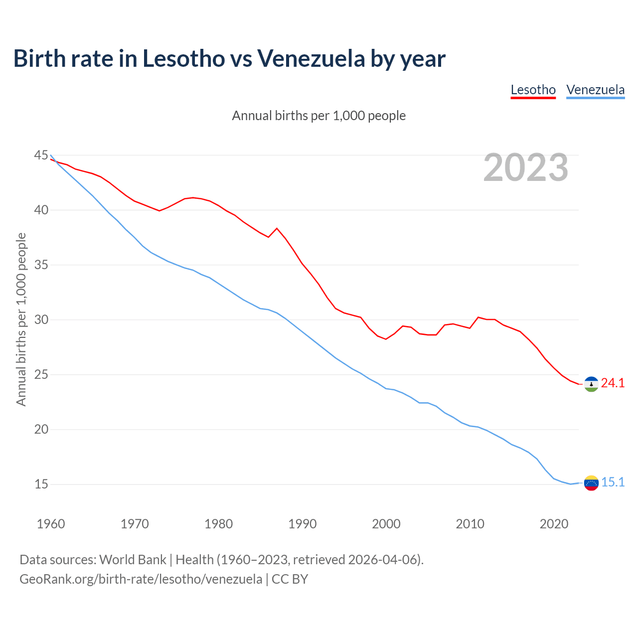Lesotho has an annual birth rate of 24.1 births per 1,000 people, compared to 15.1 for Venezuela. The average number of children a woman is expected to have during her lifetime — the fertility rate, is 2.69 in Lesotho and 2.08 in Venezuela — 22.8% difference.