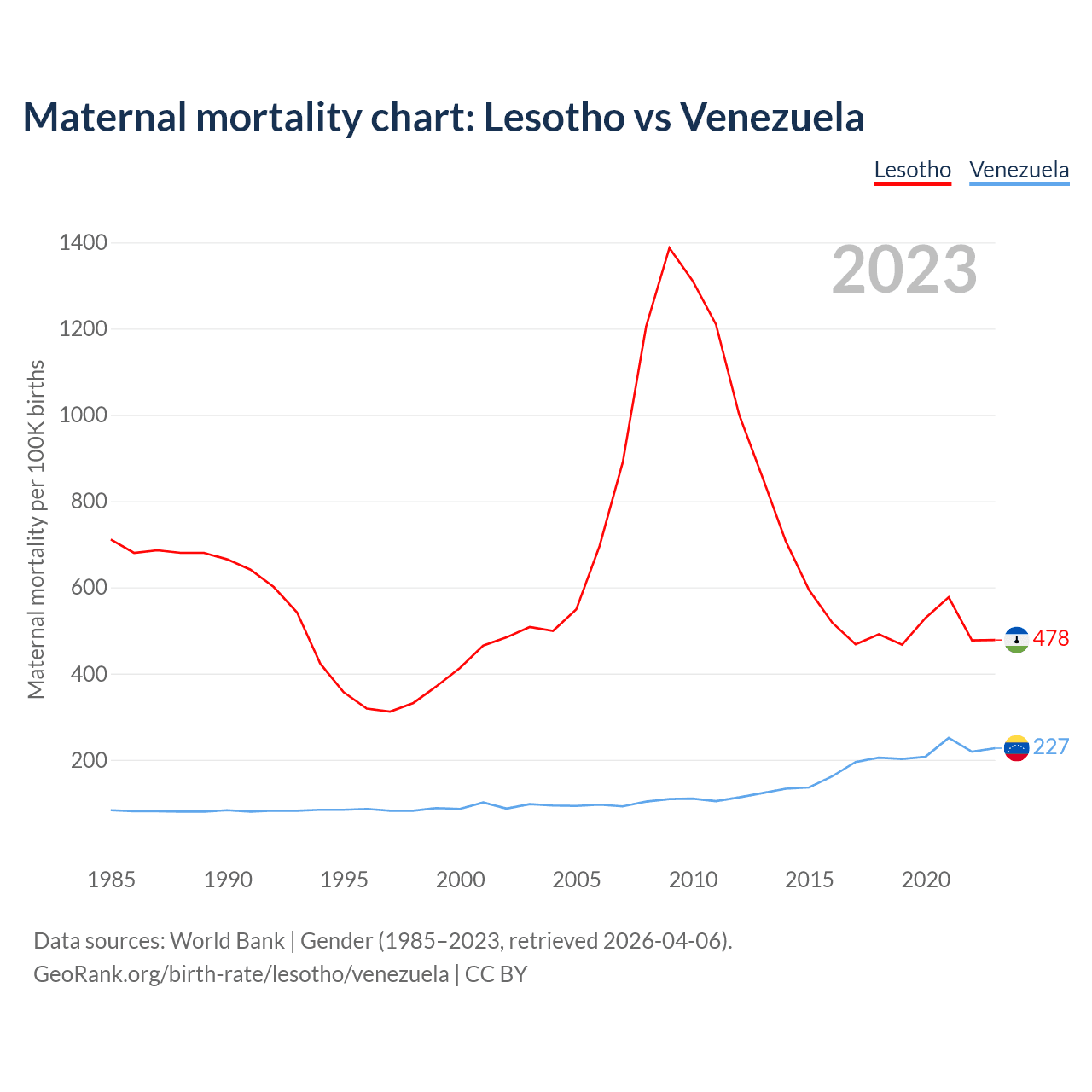 The maternal mortality rate, which is the probability of dying during childbirth or within 42 days of pregnancy termination, is 478 deaths per 100,000 live births in Lesotho, compared to 227 deaths in Venezuela.