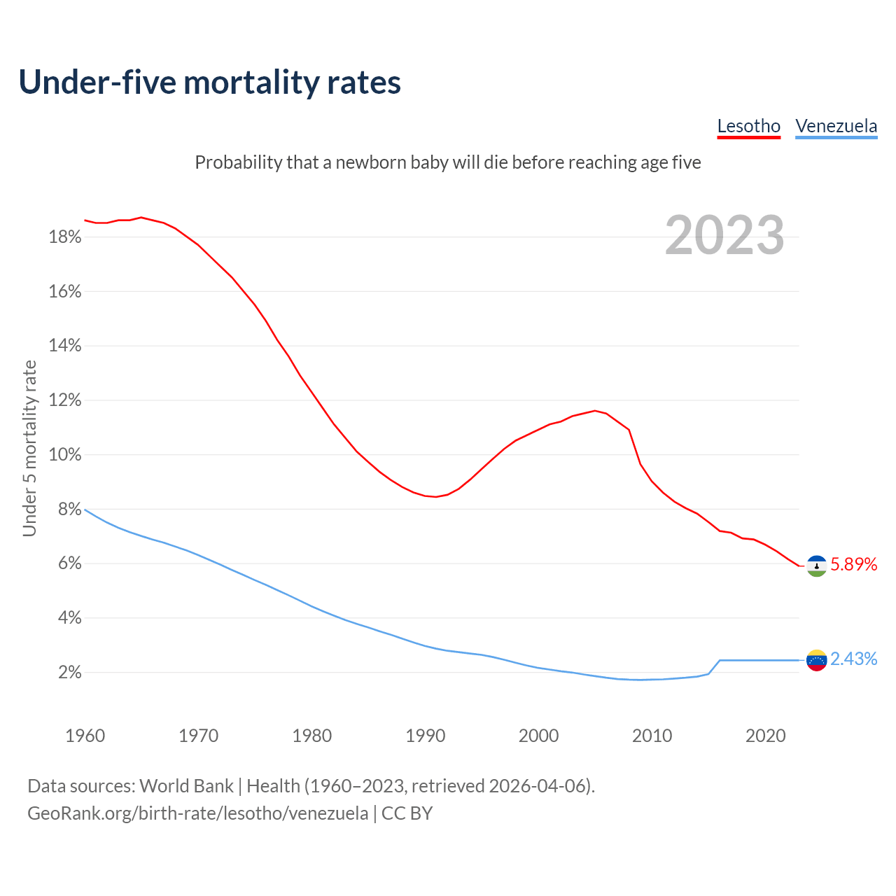 The chance that a newborn baby will die before reaching age five is 5.89% in Lesotho and 2.43% in Venezuela. Above is a chart with historical data on under-five mortality rates.