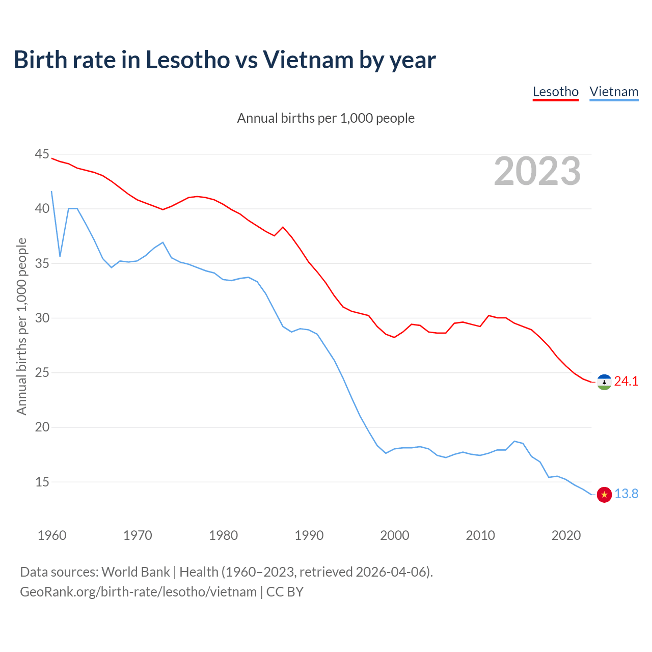 Lesotho has an annual birth rate of 24.1 births per 1,000 people, compared to 13.8 for Vietnam. The average number of children a woman is expected to have during her lifetime — the fertility rate, is 2.69 in Lesotho and 1.91 in Vietnam — 29% difference.