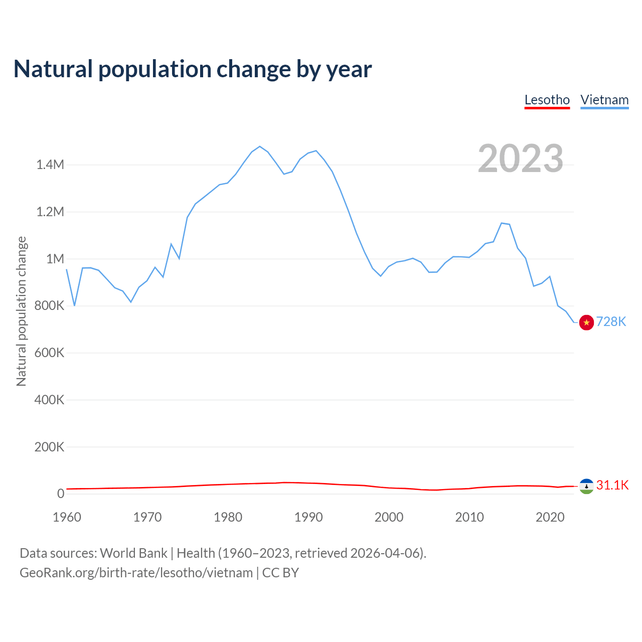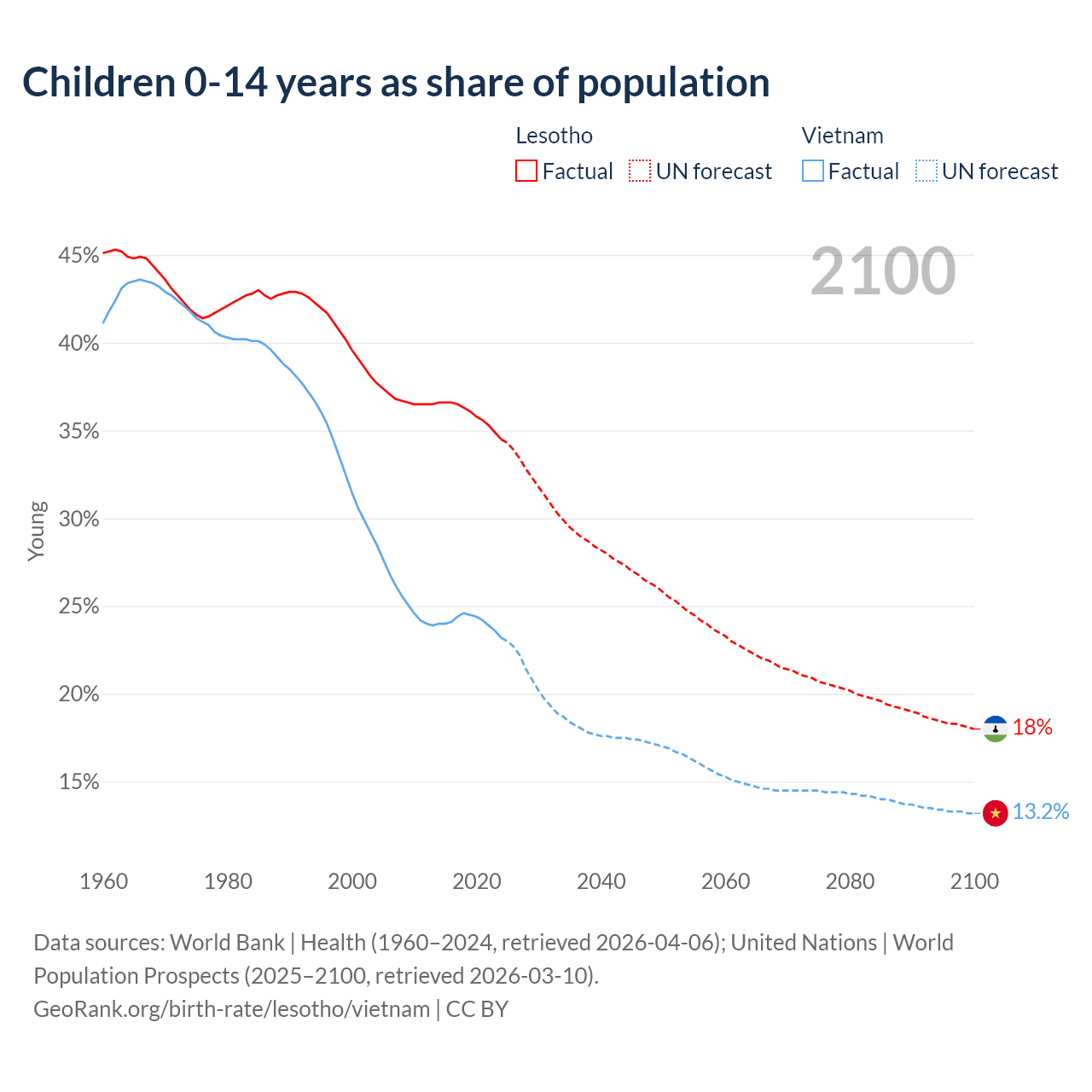 According to the latest available data on birth rates, the fertility rate in Lesotho was 2.69 children per woman in 2023, compared to 1.91 in Vietnam in 2023. The replacement level is considered to be 2.1 children per woman.