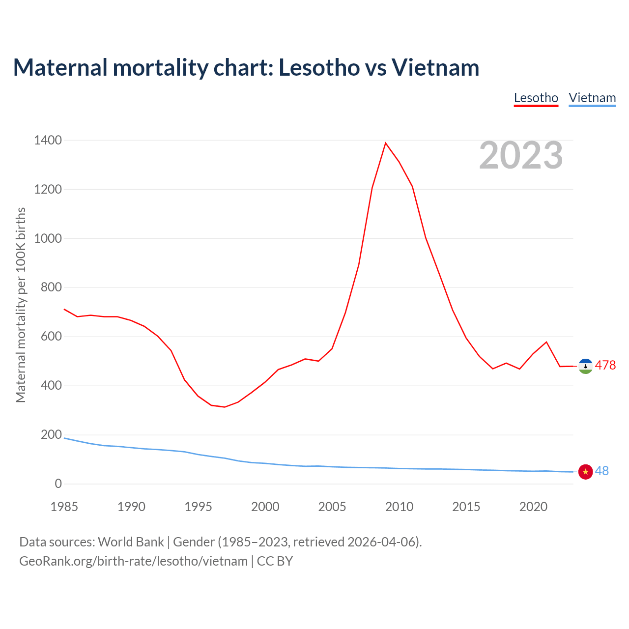 The maternal mortality rate, which is the probability of dying during childbirth or within 42 days of pregnancy termination, is 478 deaths per 100,000 live births in Lesotho, compared to 48 deaths in Vietnam.