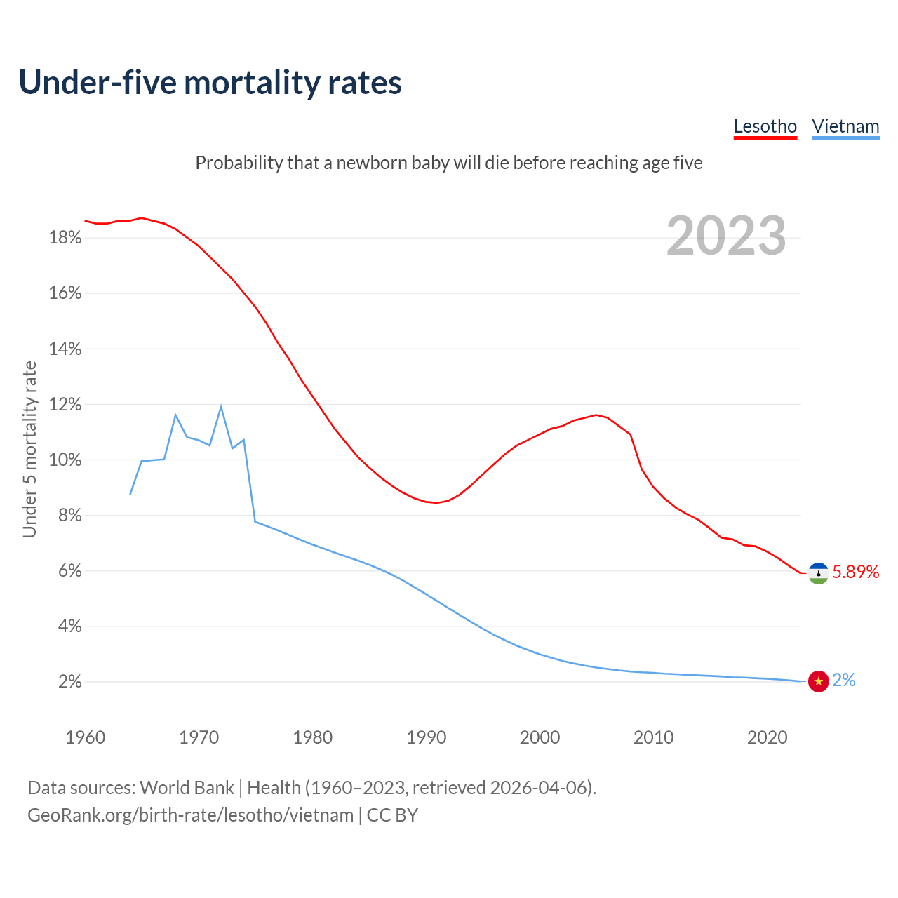 The chance that a newborn baby will die before reaching age five is 5.89% in Lesotho and 2% in Vietnam. Above is a chart with historical data on under-five mortality rates.