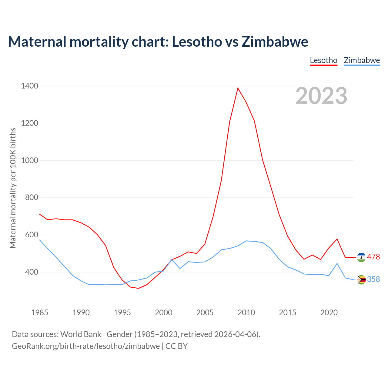 The maternal mortality rate, which is the probability of dying during childbirth or within 42 days of pregnancy termination, is 478 deaths per 100,000 live births in Lesotho, compared to 358 deaths in Zimbabwe.