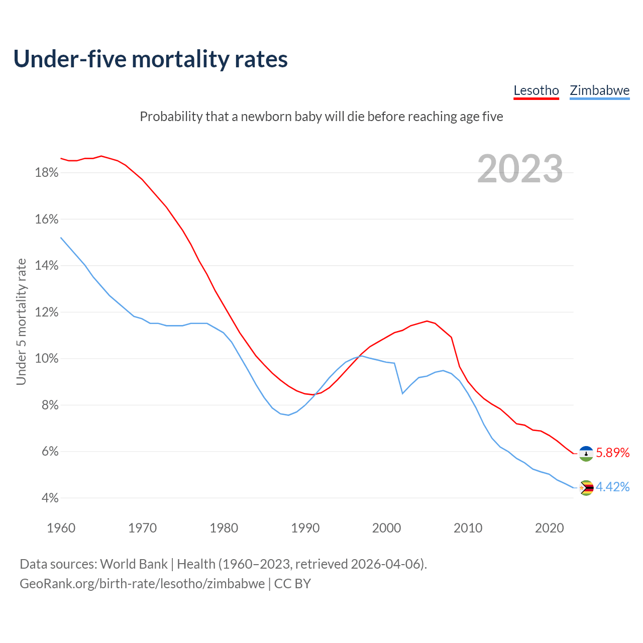 The chance that a newborn baby will die before reaching age five is 5.89% in Lesotho and 4.42% in Zimbabwe. Above is a chart with historical data on under-five mortality rates.