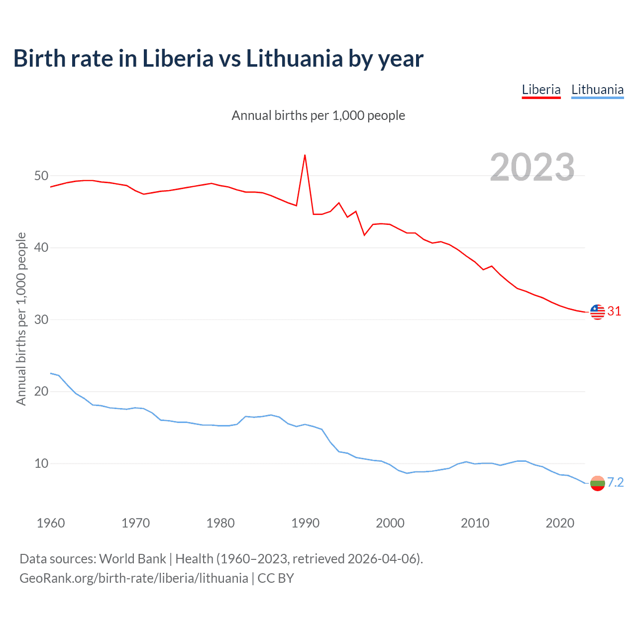 Liberia has an annual birth rate of 31 births per 1,000 people, compared to 7.2 for Lithuania. The average number of children a woman is expected to have during her lifetime — the fertility rate, is 3.95 in Liberia and 1.18 in Lithuania — 70.1% difference.
