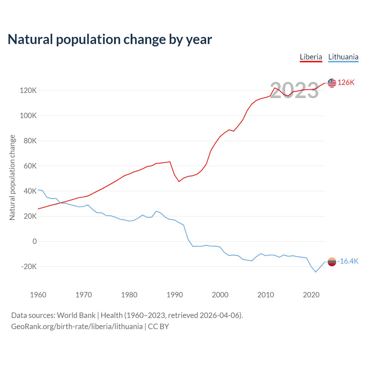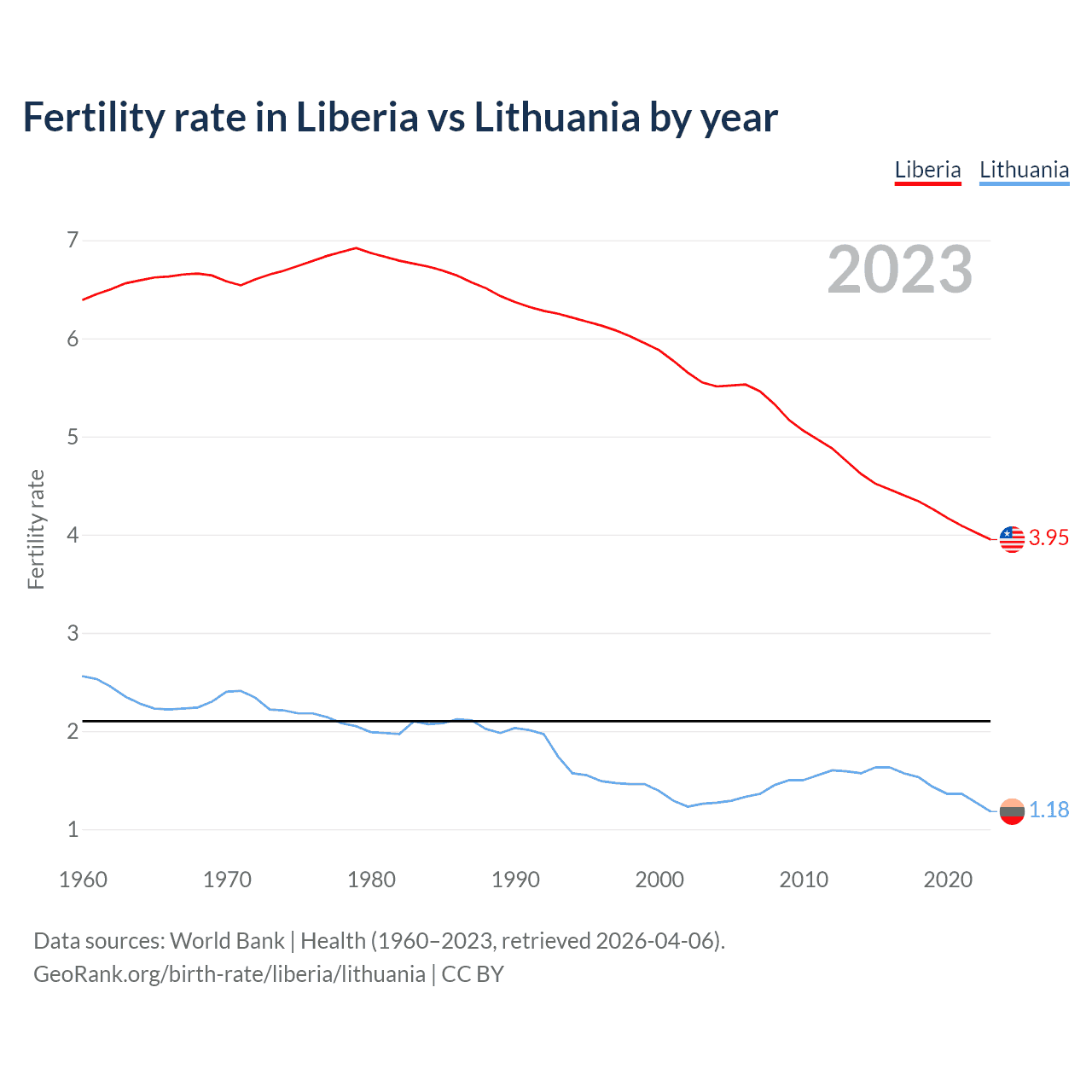 According to the latest available data on birth rates, the fertility rate in Liberia was 3.95 children per woman in 2023, compared to 1.18 in Lithuania in 2023. The replacement level is considered to be 2.1 children per woman.