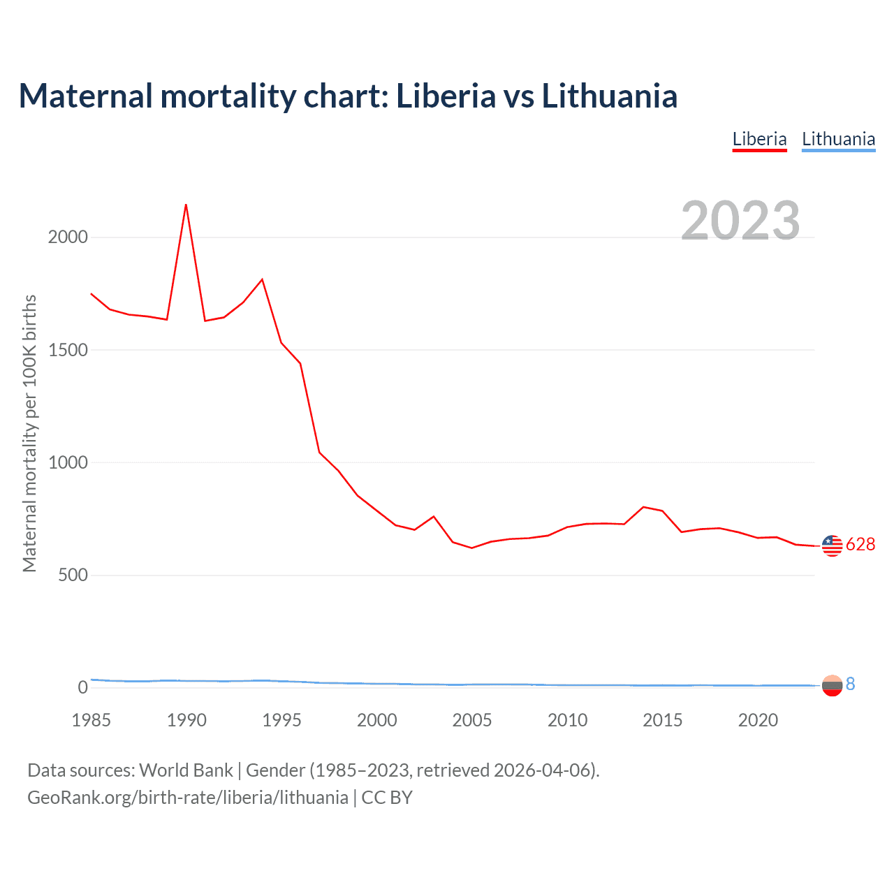 The maternal mortality rate, which is the probability of dying during childbirth or within 42 days of pregnancy termination, is 628 deaths per 100,000 live births in Liberia, compared to 8 deaths in Lithuania.