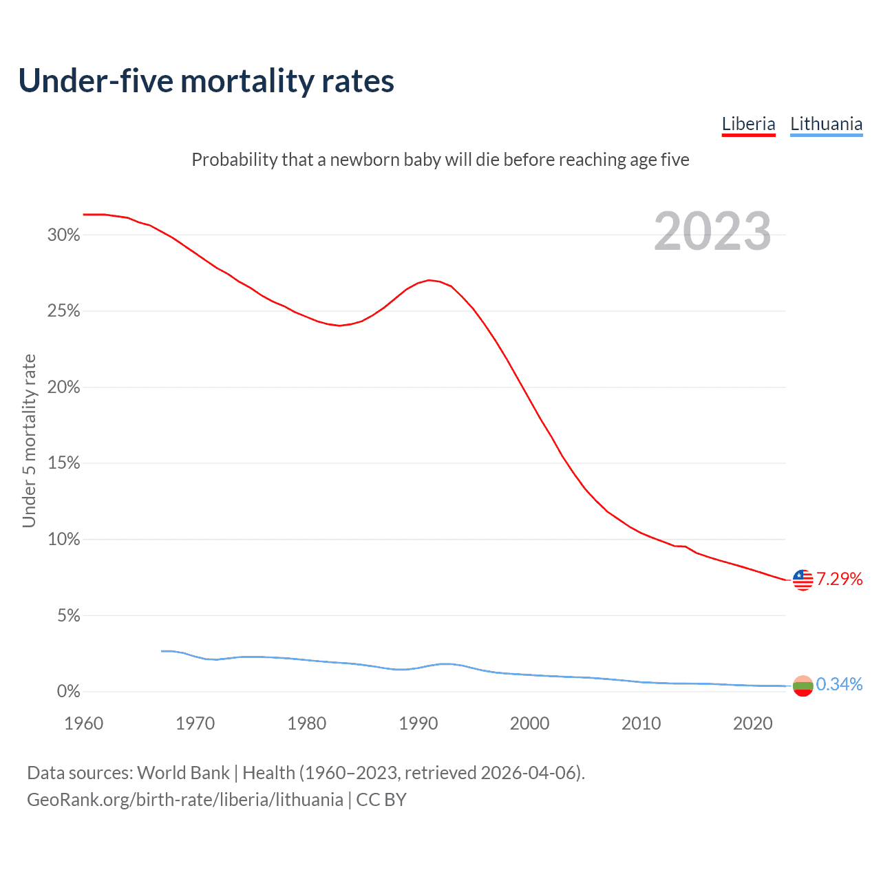 The chance that a newborn baby will die before reaching age five is 7.29% in Liberia and 0.34% in Lithuania. Above is a chart with historical data on under-five mortality rates.