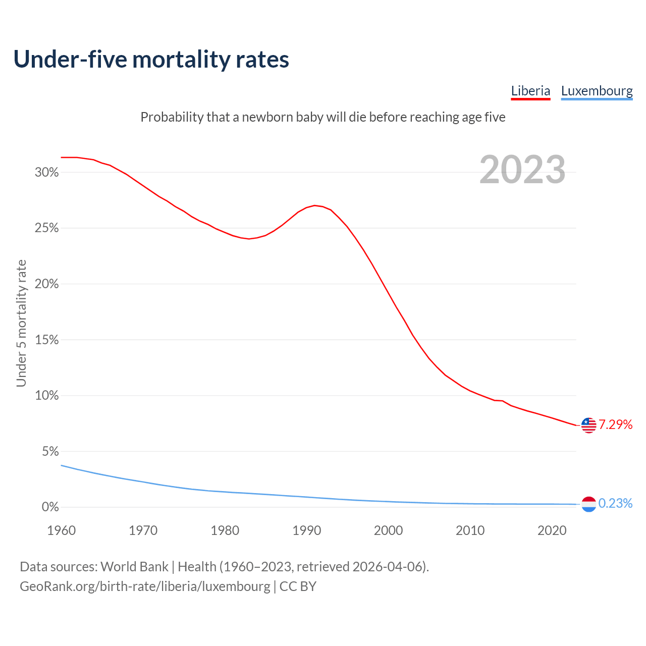 The chance that a newborn baby will die before reaching age five is 7.29% in Liberia and 0.23% in Luxembourg. Above is a chart with historical data on under-five mortality rates.