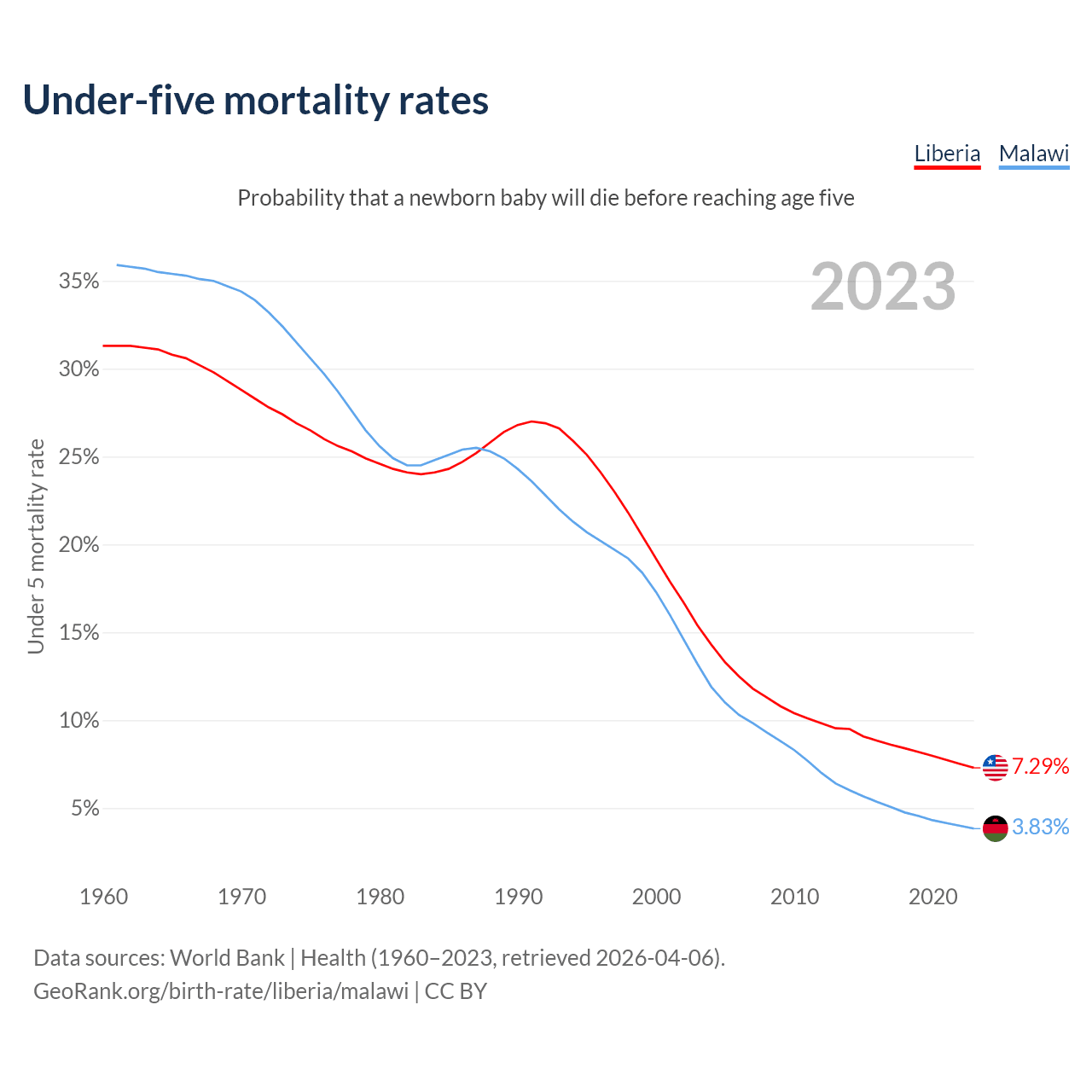 The chance that a newborn baby will die before reaching age five is 7.29% in Liberia and 3.83% in Malawi. Above is a chart with historical data on under-five mortality rates.