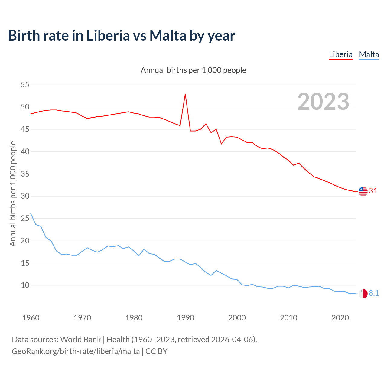 Liberia has an annual birth rate of 31 births per 1,000 people, compared to 8.1 for Malta. The average number of children a woman is expected to have during her lifetime — the fertility rate, is 3.95 in Liberia and 1.06 in Malta — 73.2% difference.