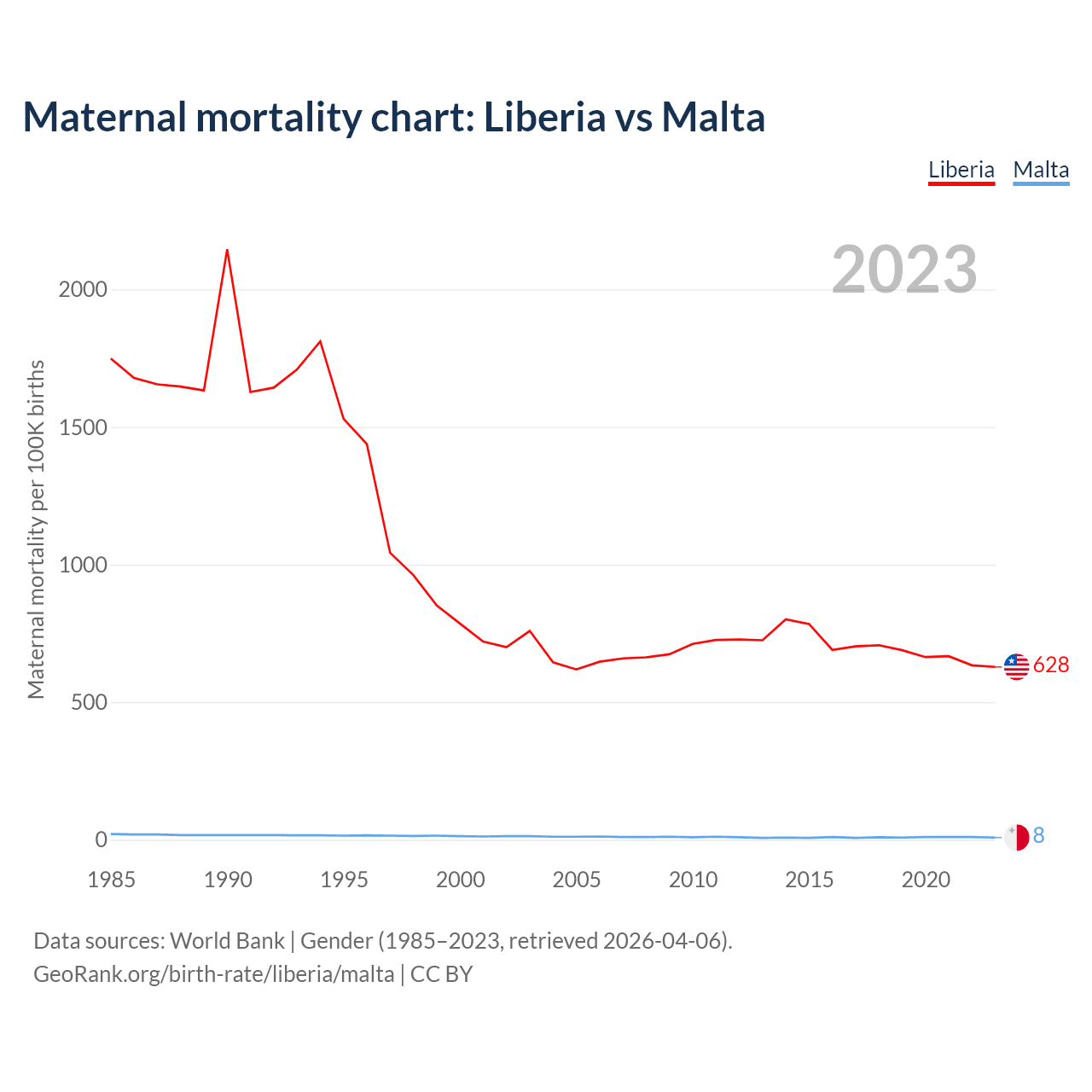 The maternal mortality rate, which is the probability of dying during childbirth or within 42 days of pregnancy termination, is 628 deaths per 100,000 live births in Liberia, compared to 8 deaths in Malta.