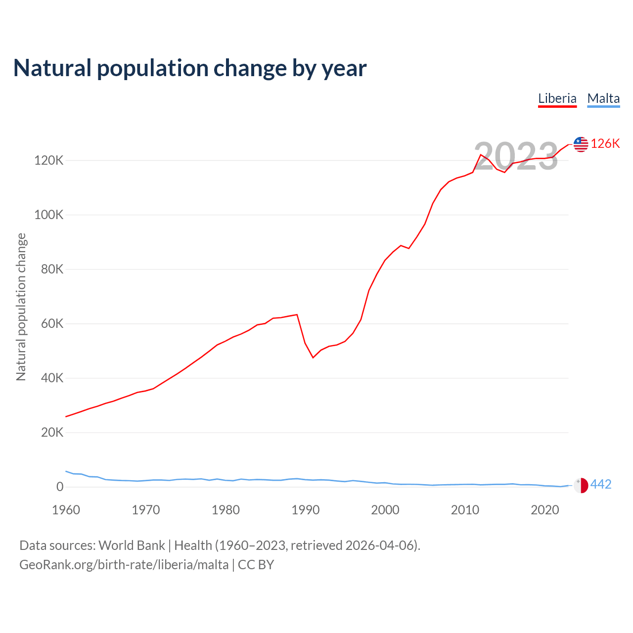 According to the latest available data on birth rates, the fertility rate in Liberia was 3.95 children per woman in 2023, compared to 1.06 in Malta in 2023. The replacement level is considered to be 2.1 children per woman.