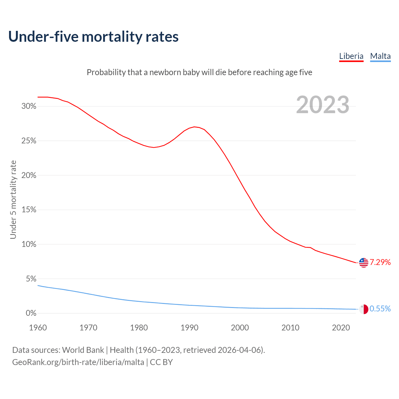 The chance that a newborn baby will die before reaching age five is 7.29% in Liberia and 0.55% in Malta. Above is a chart with historical data on under-five mortality rates.