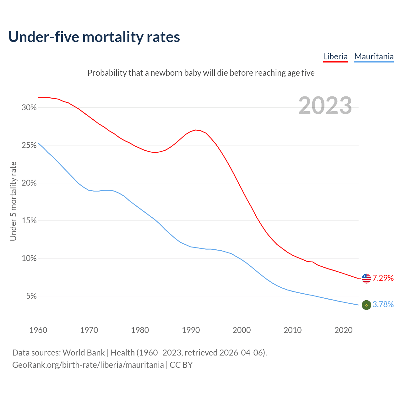 The chance that a newborn baby will die before reaching age five is 7.29% in Liberia and 3.78% in Mauritania. Above is a chart with historical data on under-five mortality rates.