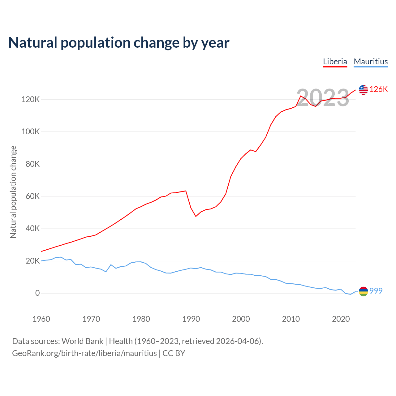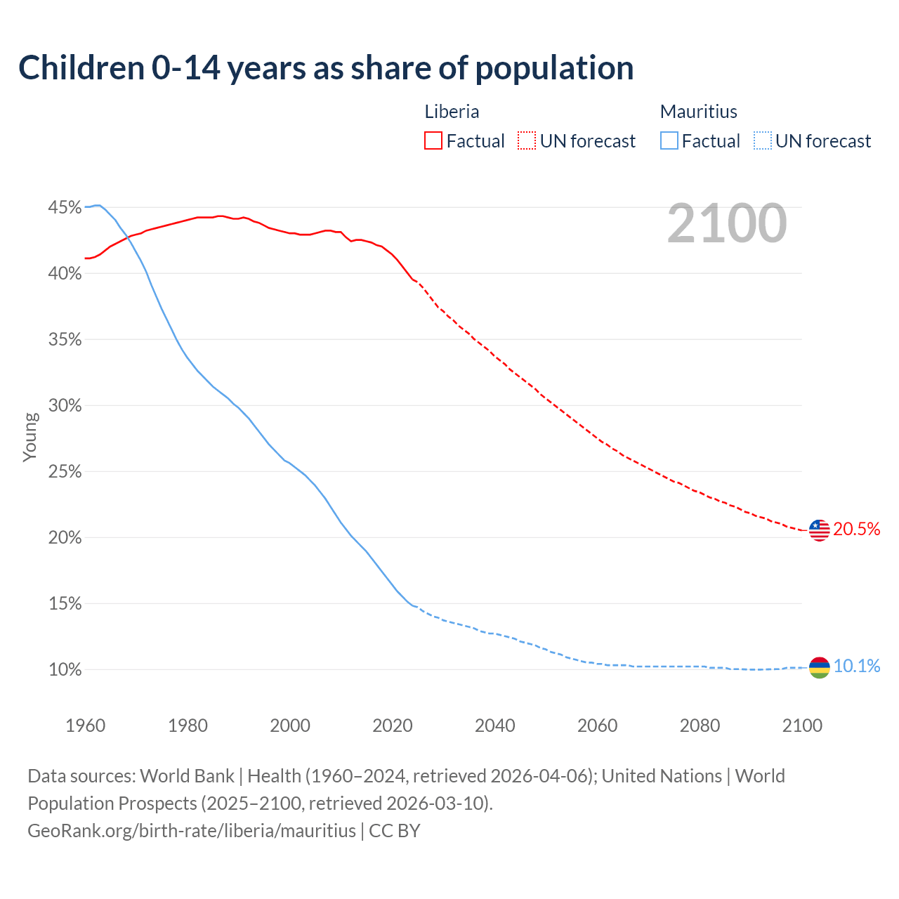 According to the latest available data on birth rates, the fertility rate in Liberia was 3.95 children per woman in 2023, compared to 1.39 in Mauritius in 2023. The replacement level is considered to be 2.1 children per woman.
