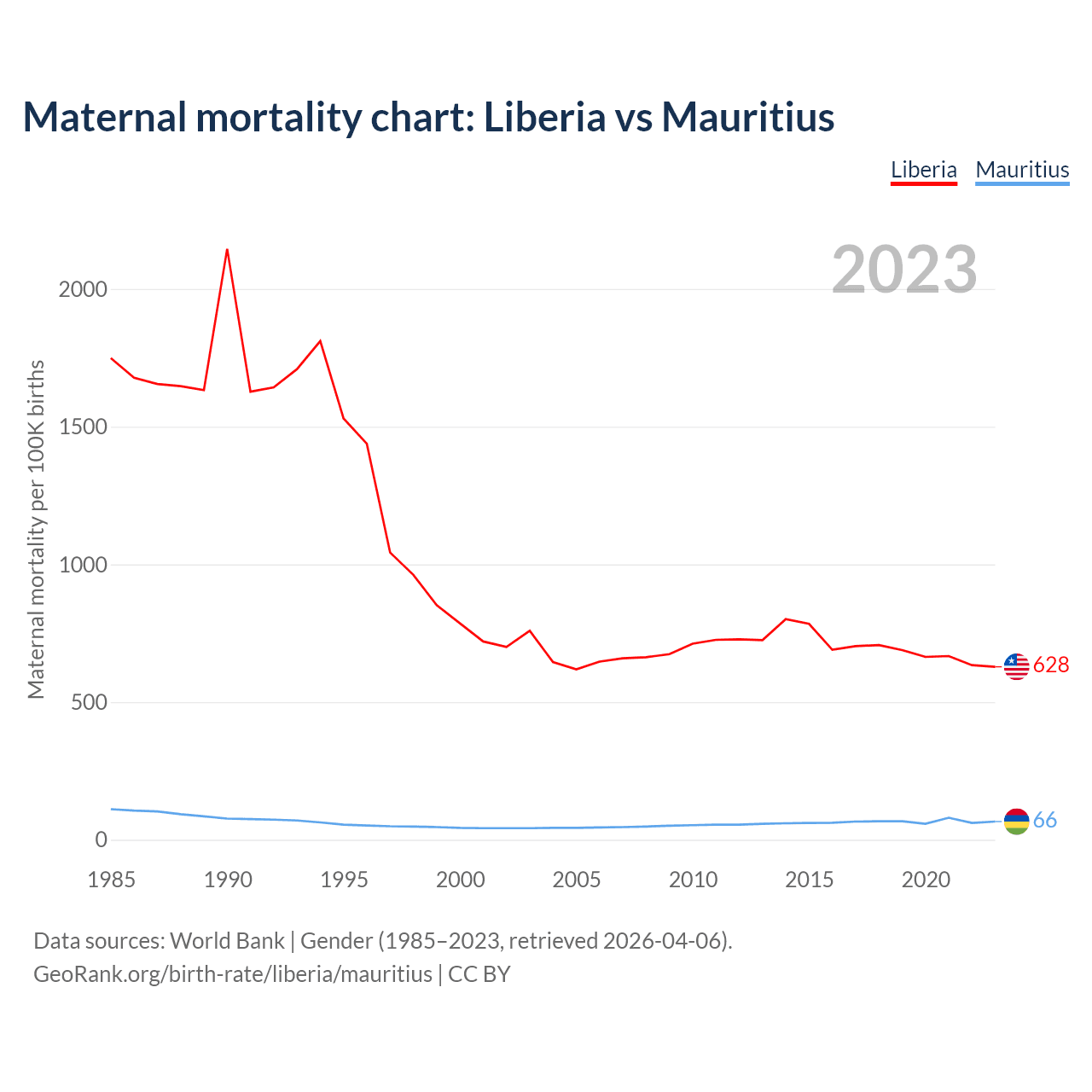 The maternal mortality rate, which is the probability of dying during childbirth or within 42 days of pregnancy termination, is 628 deaths per 100,000 live births in Liberia, compared to 66 deaths in Mauritius.