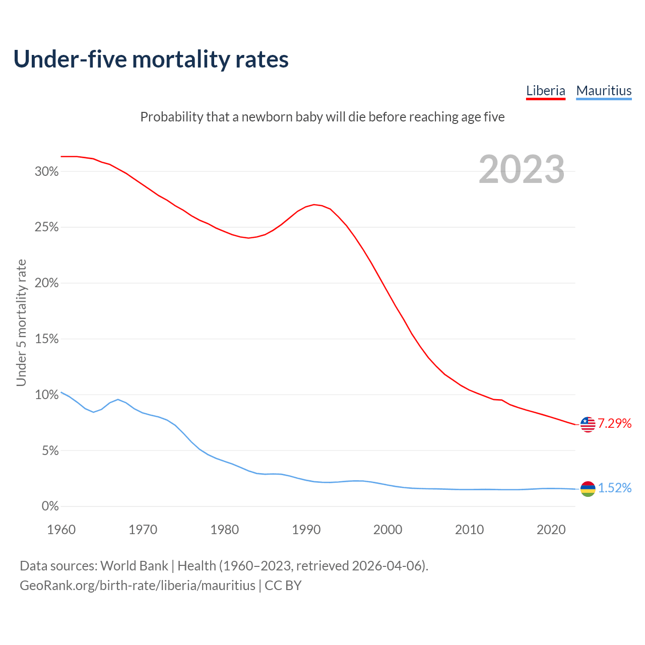 The chance that a newborn baby will die before reaching age five is 7.29% in Liberia and 1.52% in Mauritius. Above is a chart with historical data on under-five mortality rates.