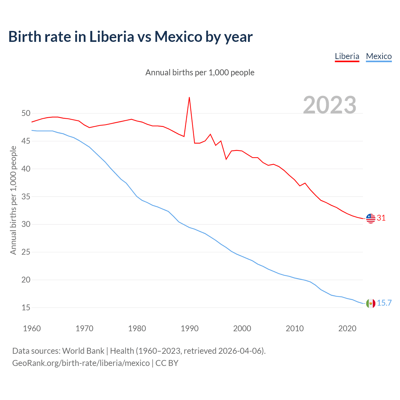 Liberia has an annual birth rate of 31 births per 1,000 people, compared to 15.7 for Mexico. The average number of children a woman is expected to have during her lifetime — the fertility rate, is 3.95 in Liberia and 1.91 in Mexico — 51.6% difference.