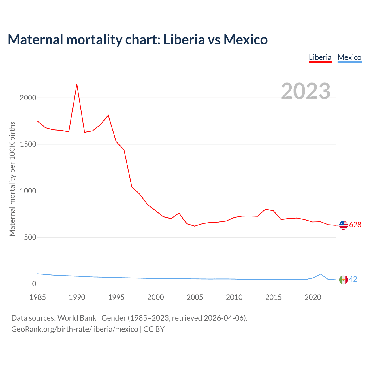 The maternal mortality rate, which is the probability of dying during childbirth or within 42 days of pregnancy termination, is 628 deaths per 100,000 live births in Liberia, compared to 42 deaths in Mexico.
