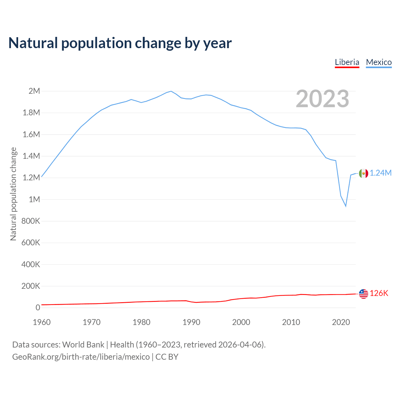 According to the latest available data on birth rates, the fertility rate in Liberia was 3.95 children per woman in 2023, compared to 1.91 in Mexico in 2023. The replacement level is considered to be 2.1 children per woman.