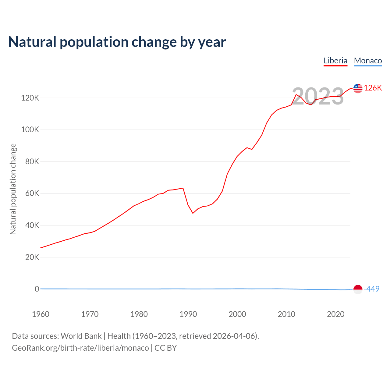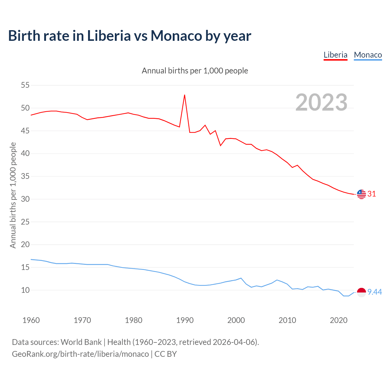 Liberia has an annual birth rate of 31 births per 1,000 people, compared to 9.44 for Monaco. The average number of children a woman is expected to have during her lifetime — the fertility rate, is 3.95 in Liberia and 2.11 in Monaco — 46.6% difference.