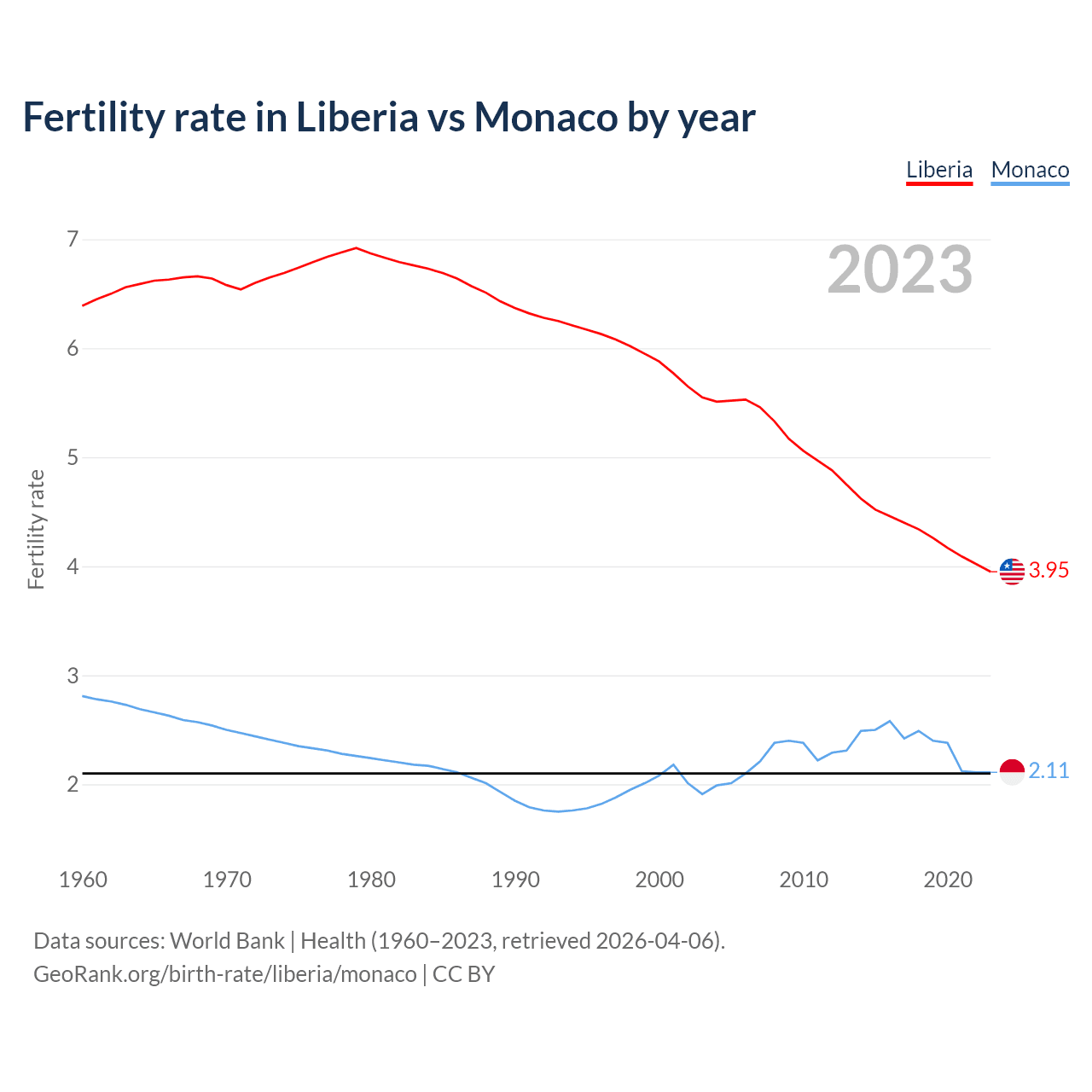 According to the latest available data on birth rates, the fertility rate in Liberia was 3.95 children per woman in 2023, compared to 2.11 in Monaco in 2023. The replacement level is considered to be 2.1 children per woman.