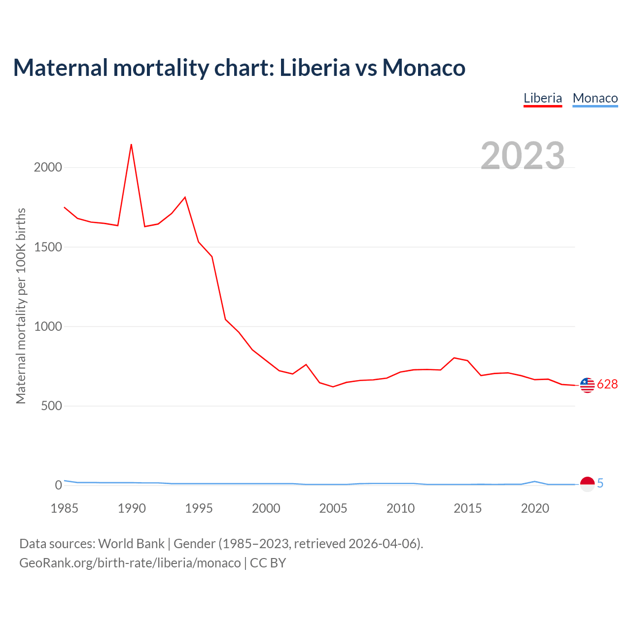 The maternal mortality rate, which is the probability of dying during childbirth or within 42 days of pregnancy termination, is 628 deaths per 100,000 live births in Liberia, compared to 5 deaths in Monaco.