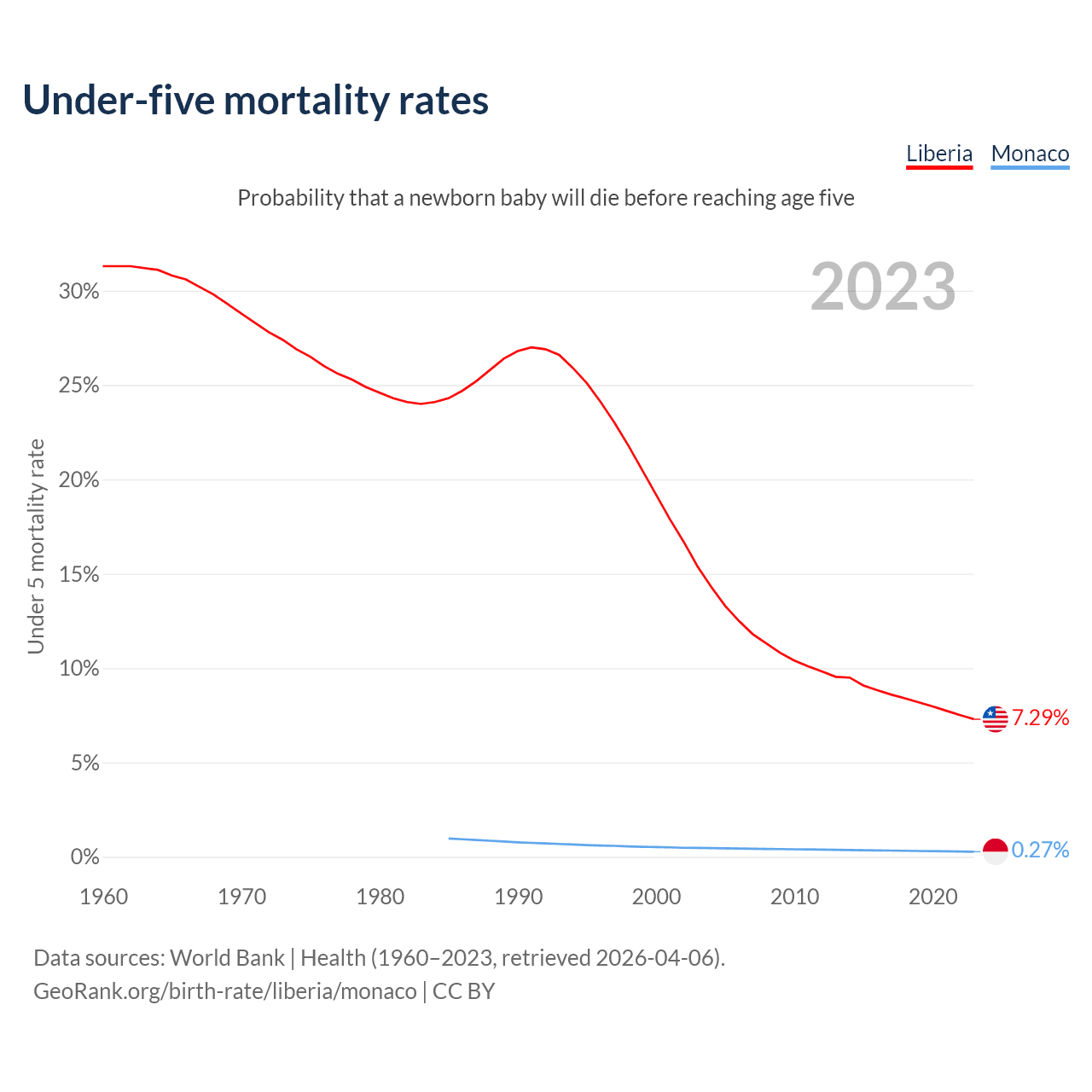 The chance that a newborn baby will die before reaching age five is 7.29% in Liberia and 0.27% in Monaco. Above is a chart with historical data on under-five mortality rates.