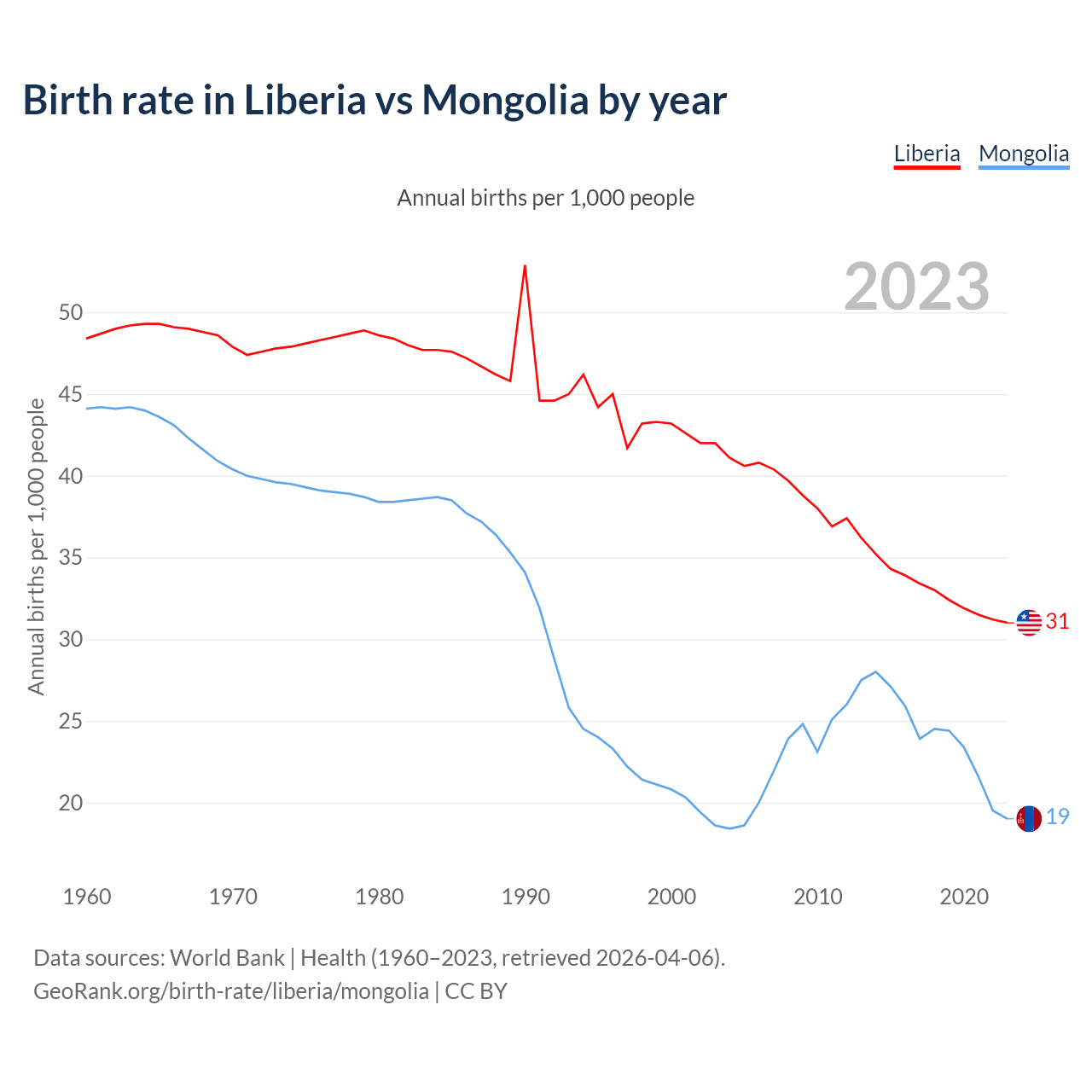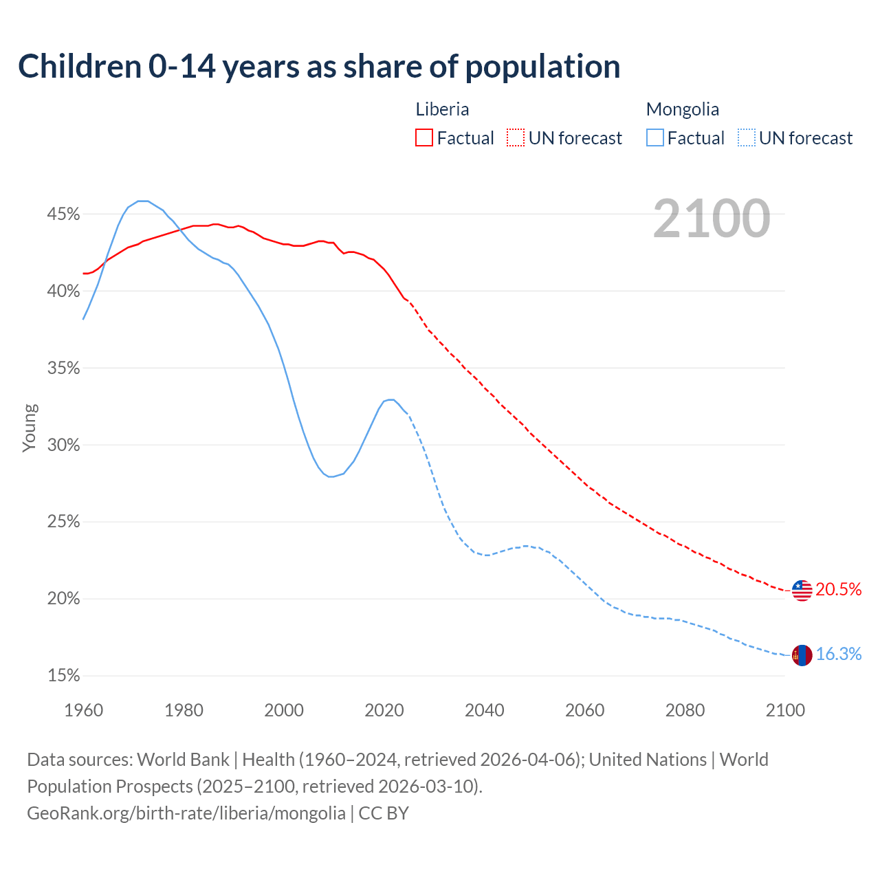 According to the latest available data on birth rates, the fertility rate in Liberia was 3.95 children per woman in 2023, compared to 2.7 in Mongolia in 2023. The replacement level is considered to be 2.1 children per woman.