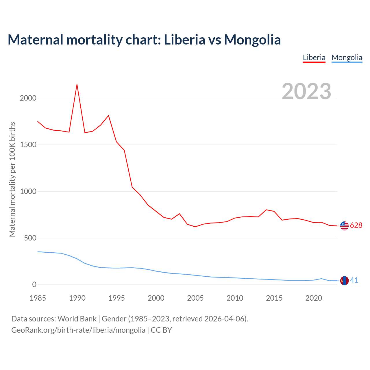 The maternal mortality rate, which is the probability of dying during childbirth or within 42 days of pregnancy termination, is 628 deaths per 100,000 live births in Liberia, compared to 41 deaths in Mongolia.